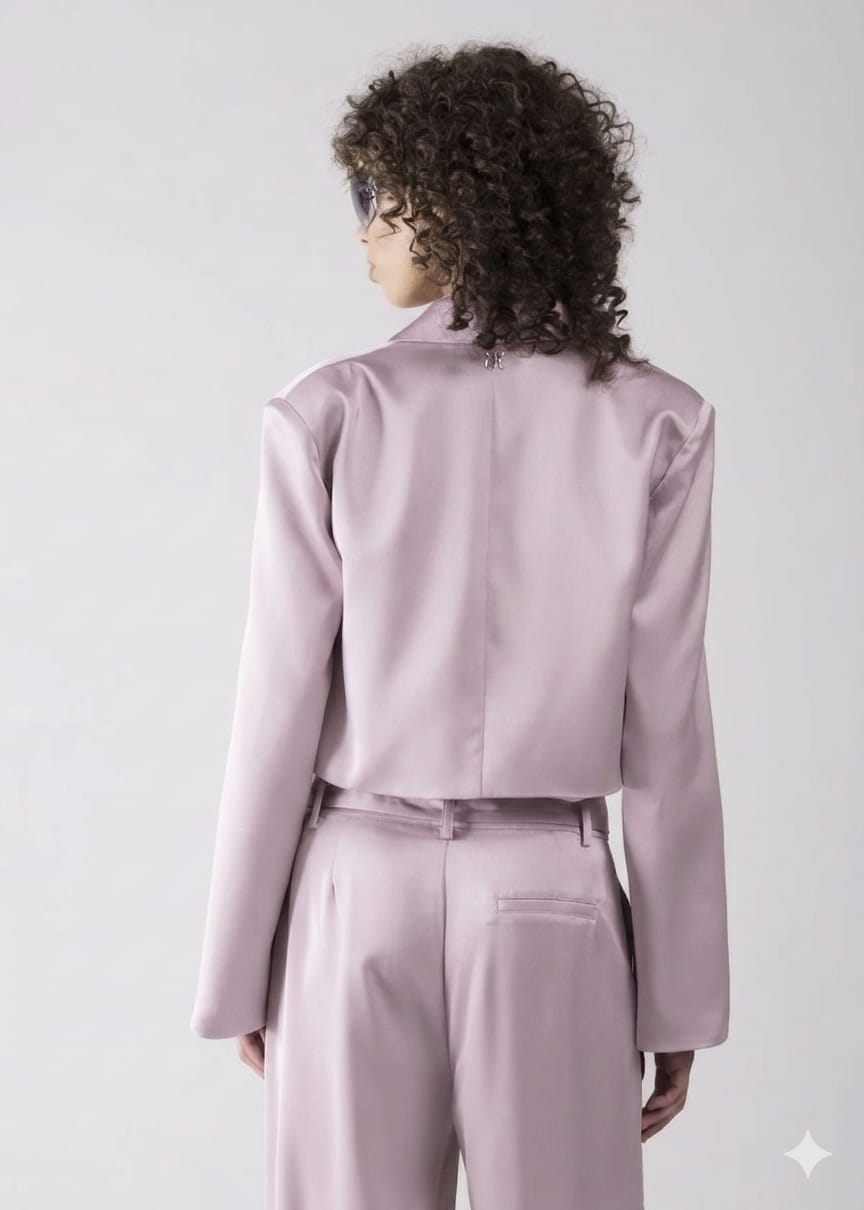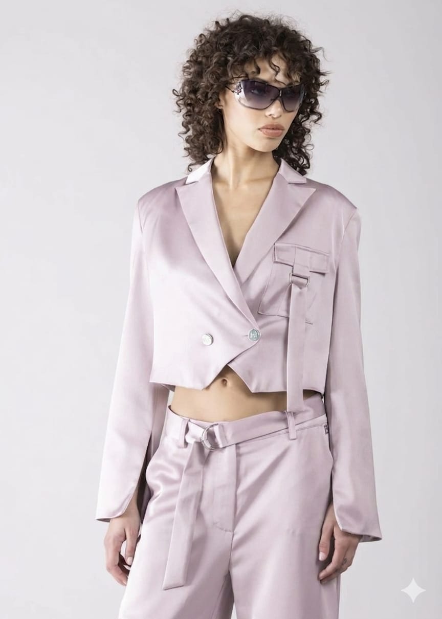 Blazer en tejido satinado, corte crop asimétrico y bolsillo decorativo en lateral.