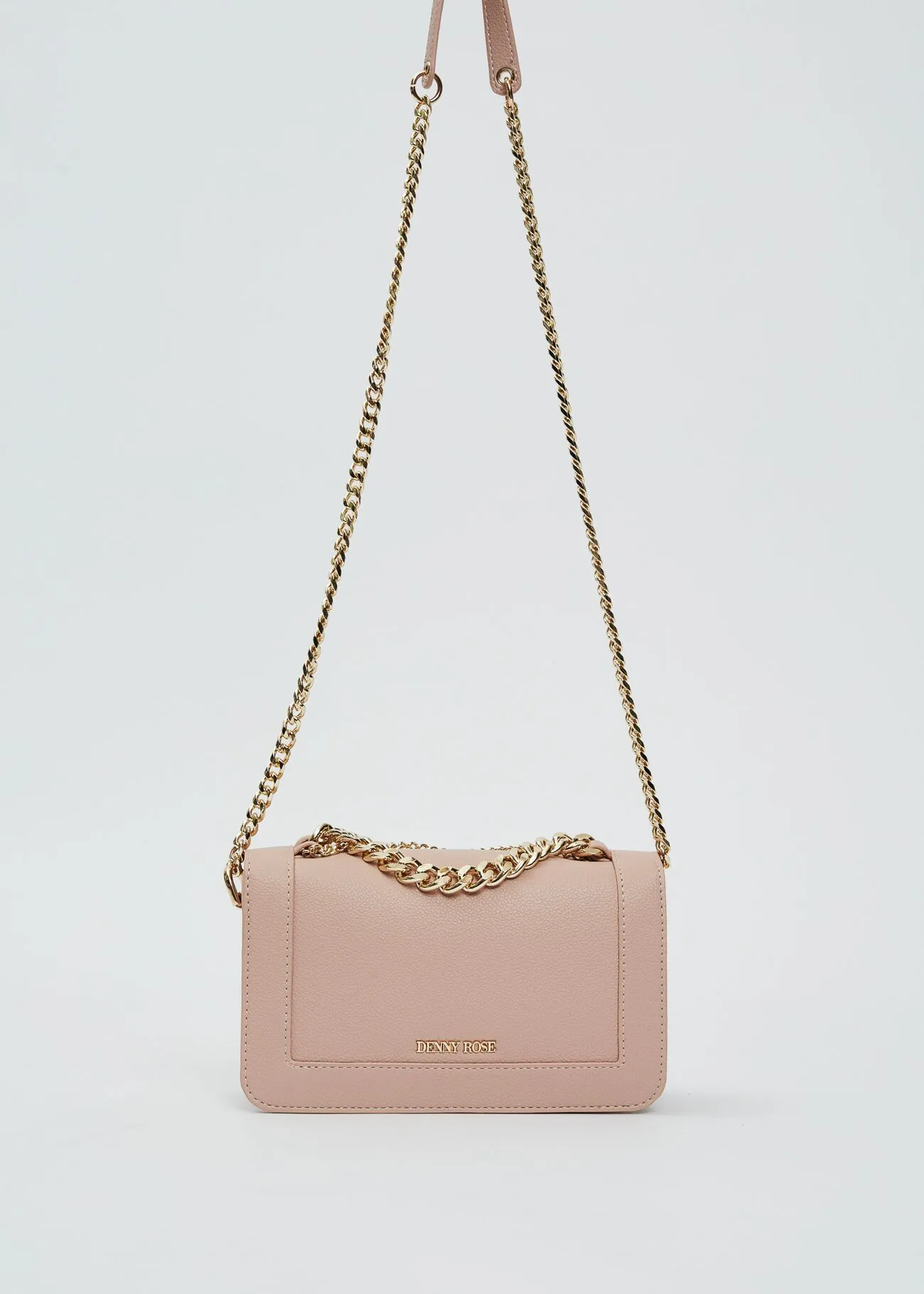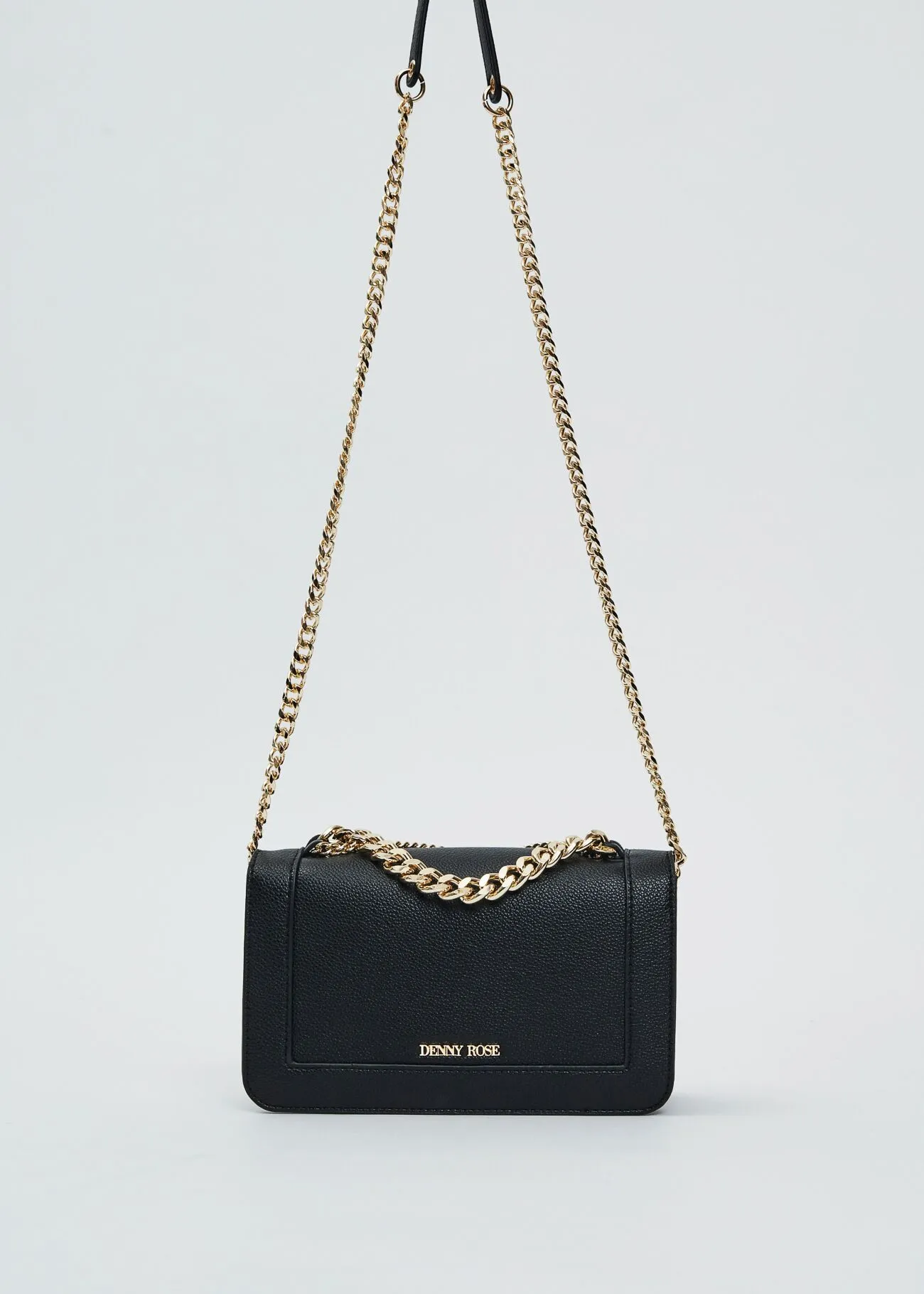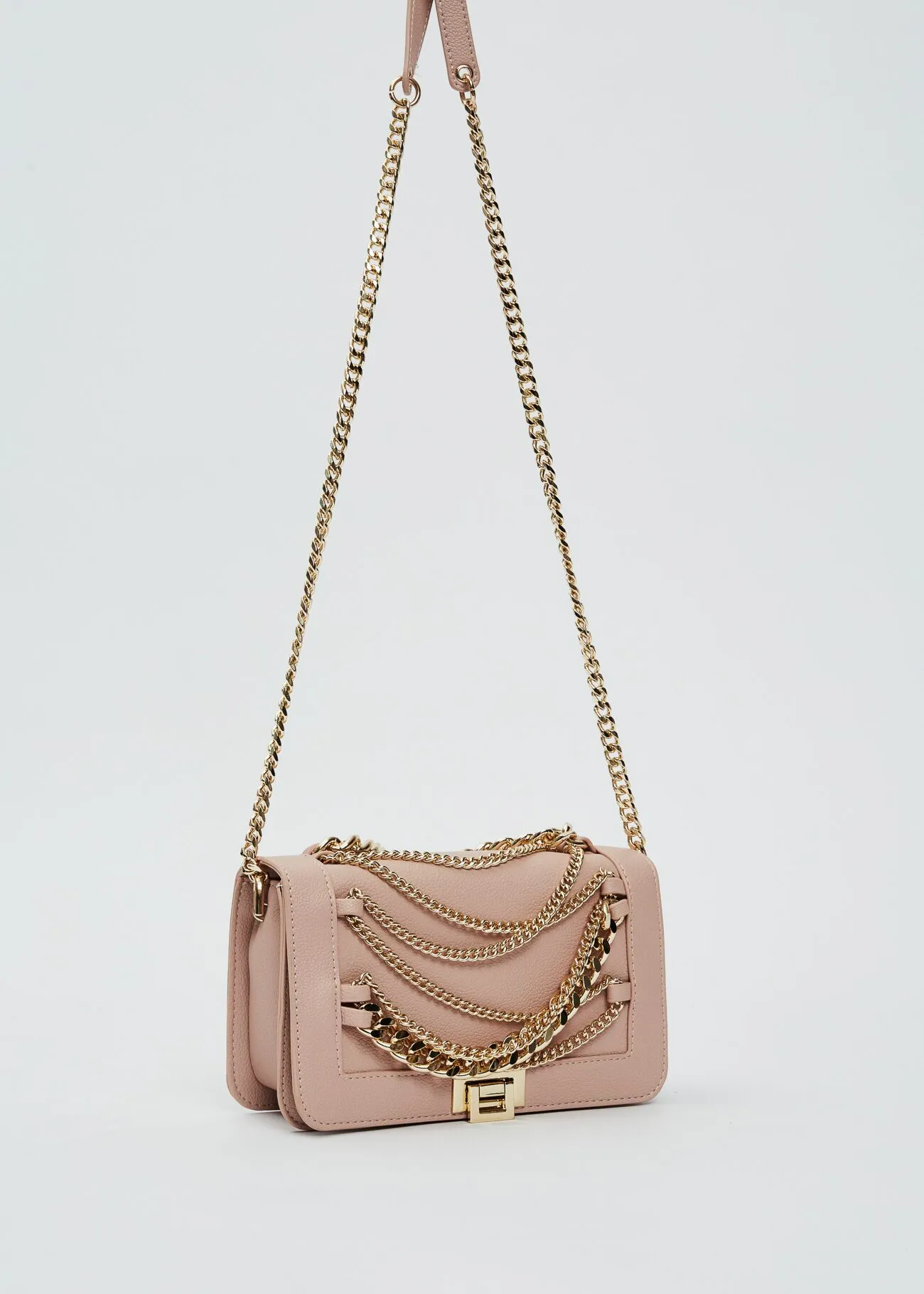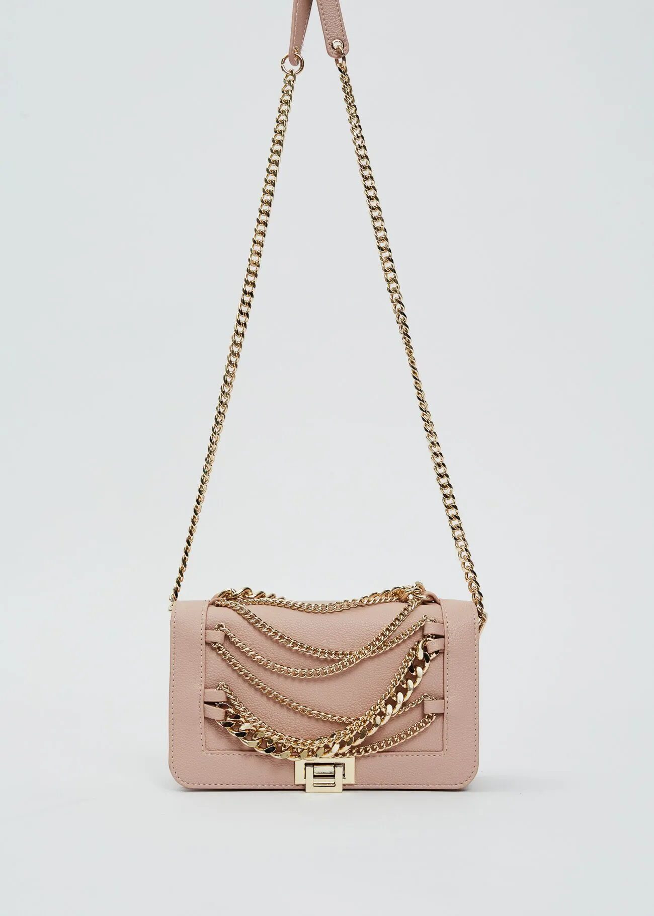 Bolso en material sintético con cadenas decorativas frontales y asa larga.