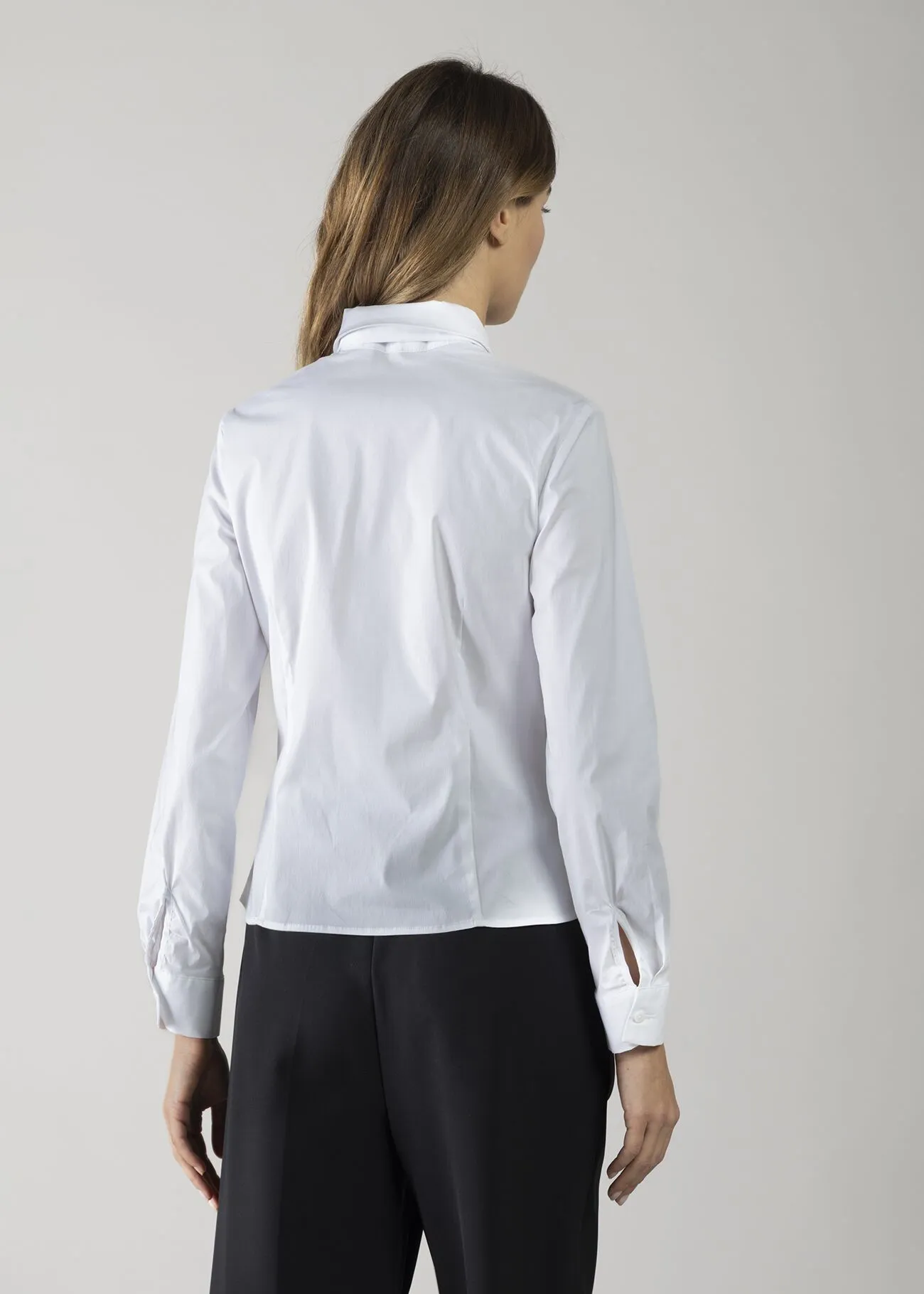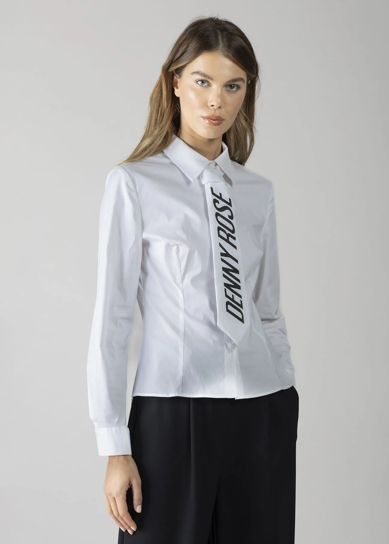 Camisa en tejido de algodón con pinzas para entallar. Corbata del mismo tejido con logo de la firma en color negro.