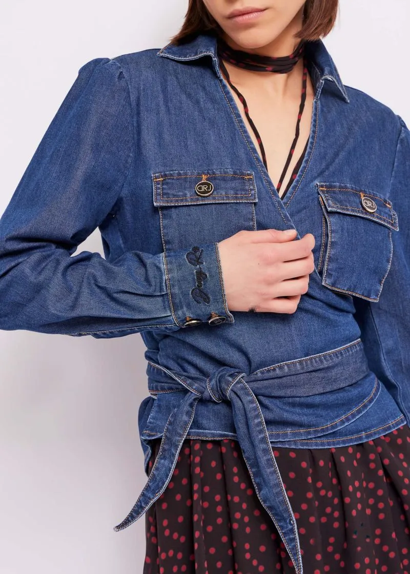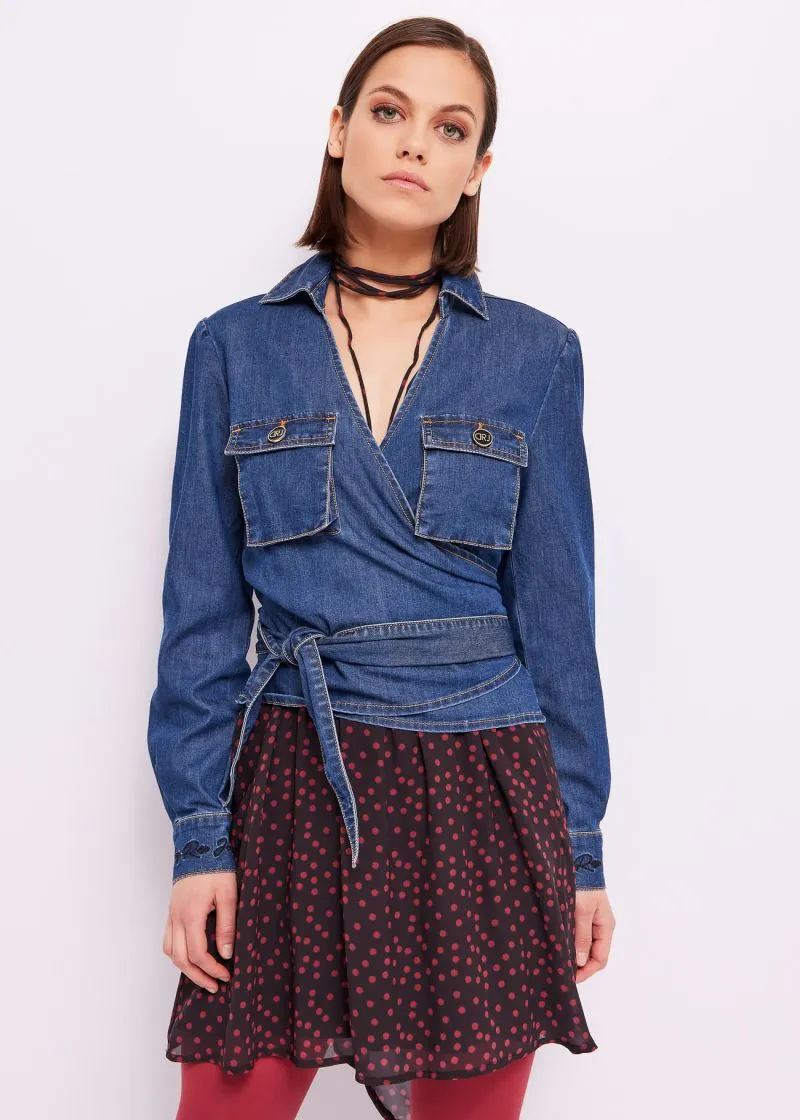 Camisa en tejido algodón jeans con elastano y corte cruzado con cintas para ajustar.