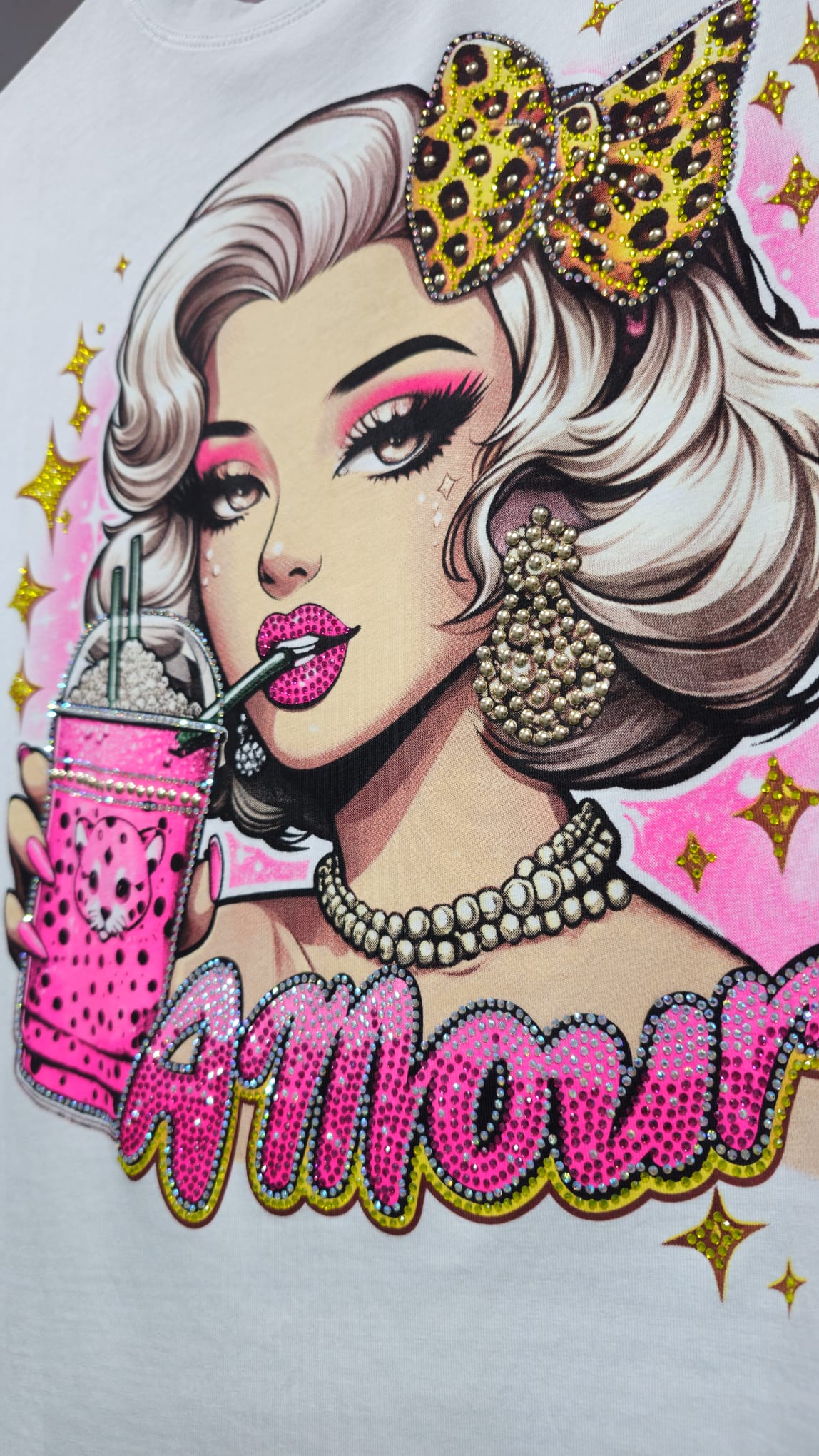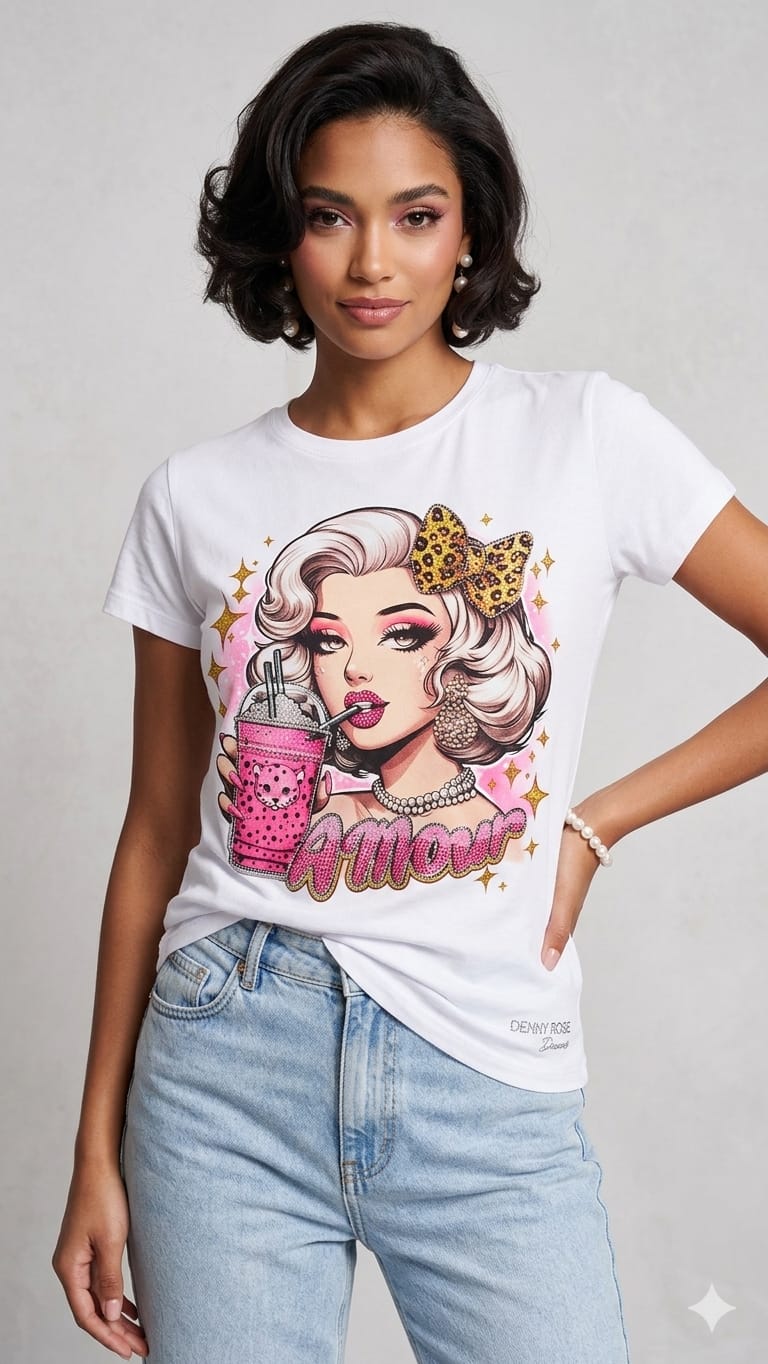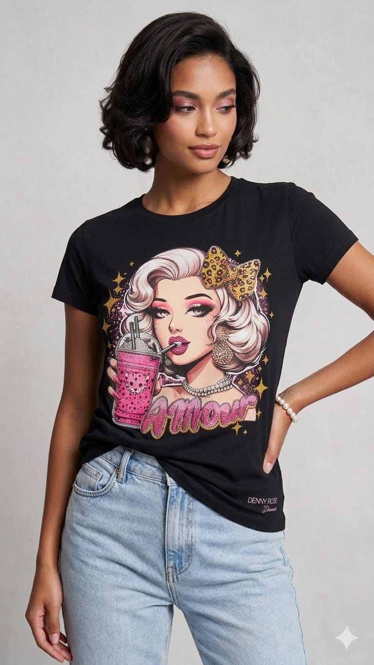 Camiseta en tejido de algodón con muñeca pin up con detalles en strass en la zona delantera. Logo de la firma en strass en la zona baja lateral.