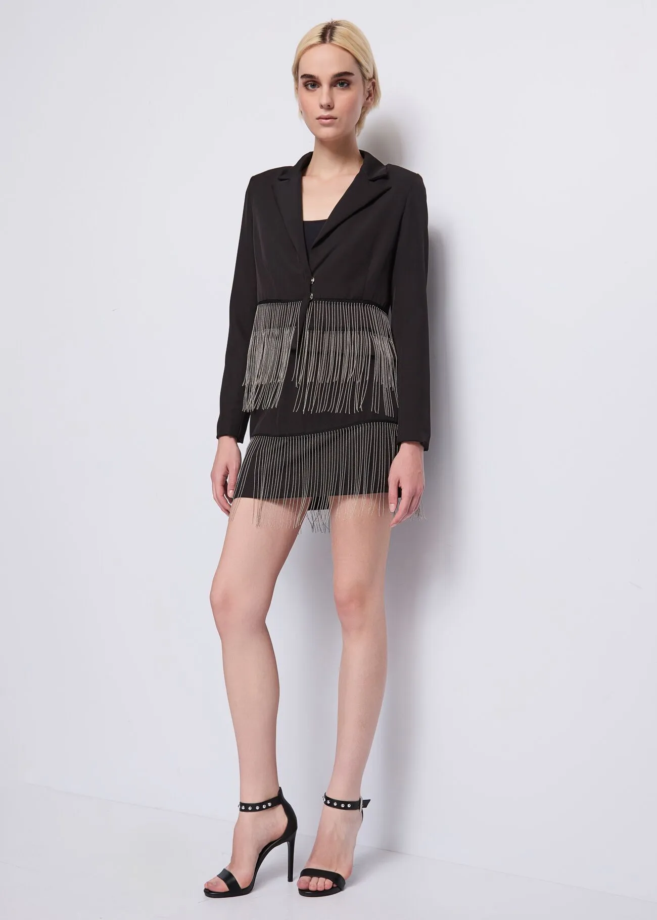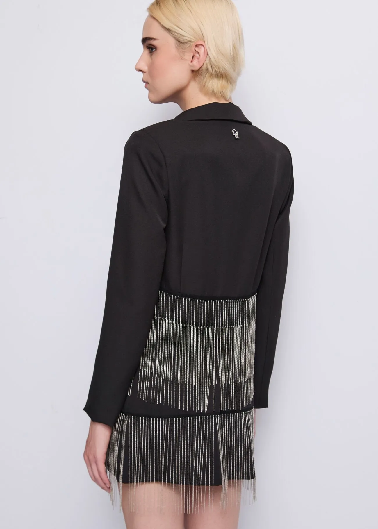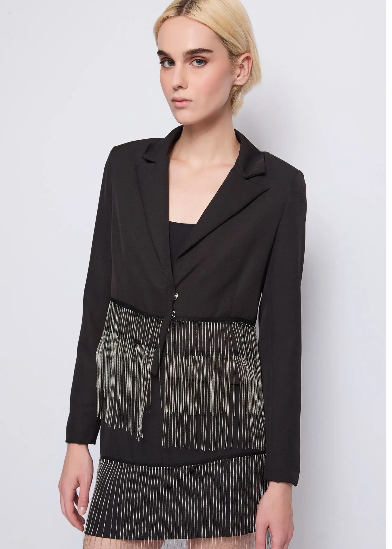Chaqueta en tejido crepe con elastano con corte tipo blazer crop y cadenas decorativas.