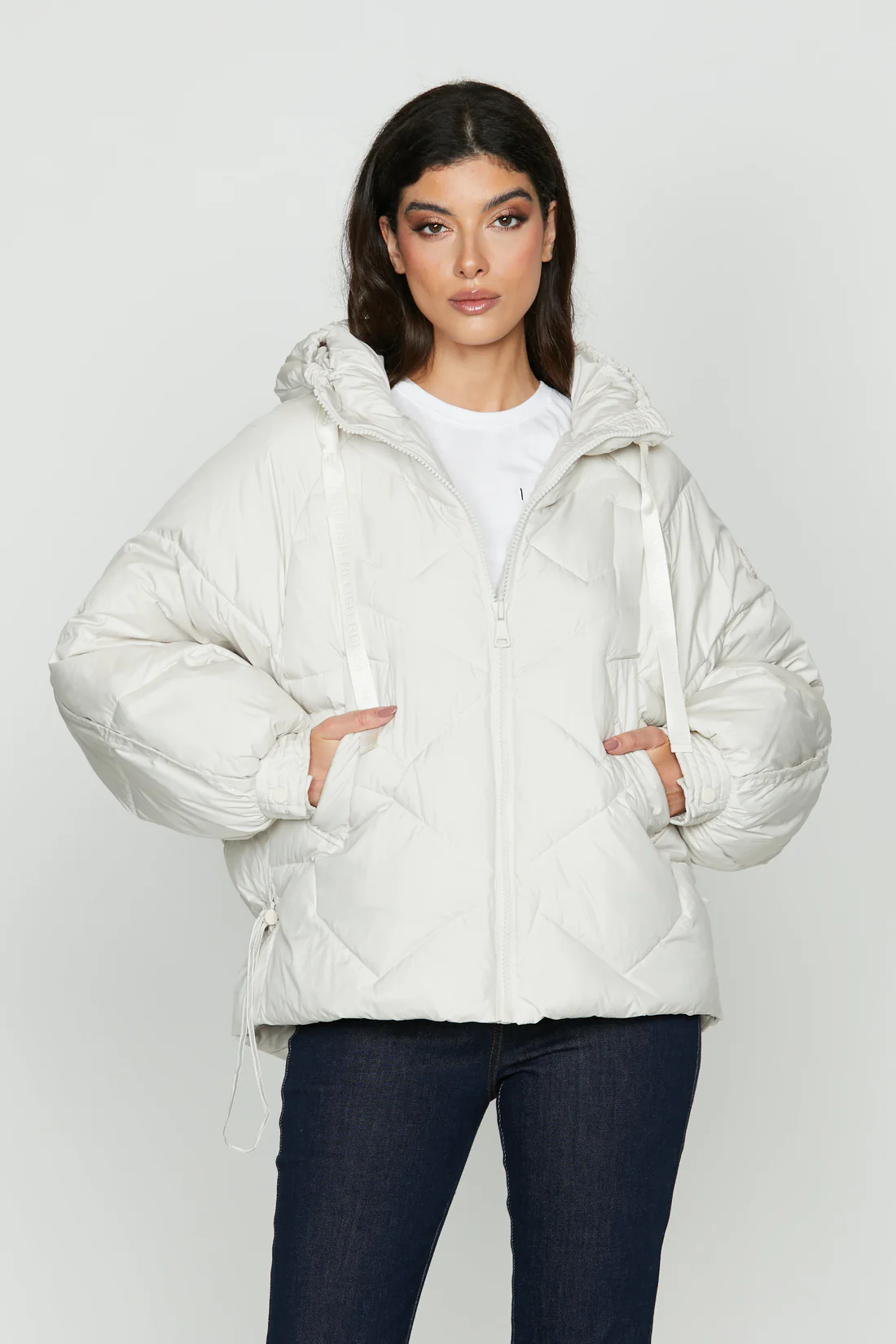 Chaquetón en material sintético con corte oversize y gomas ajustables en laterales.