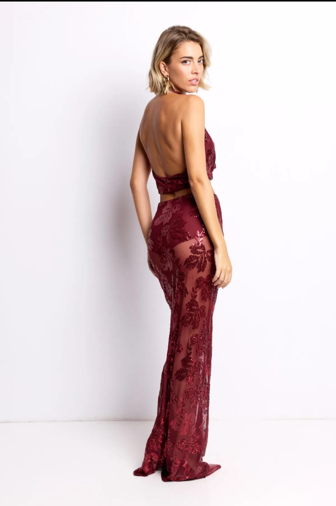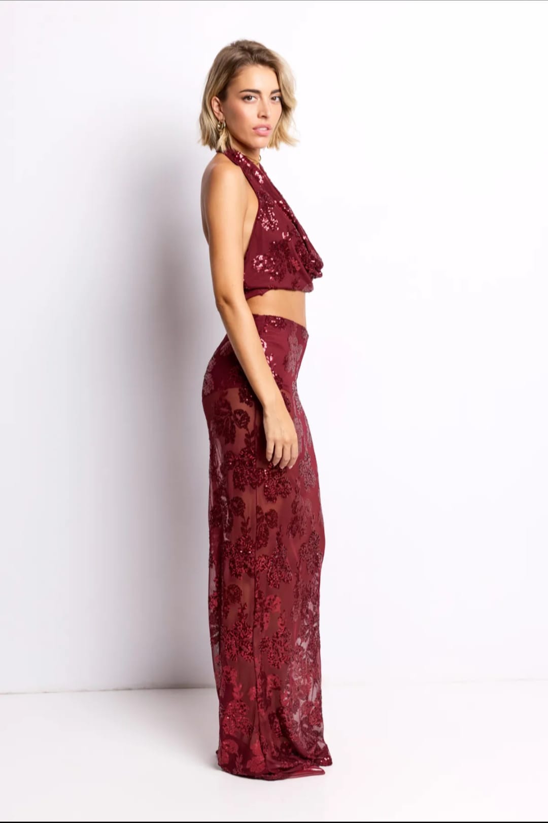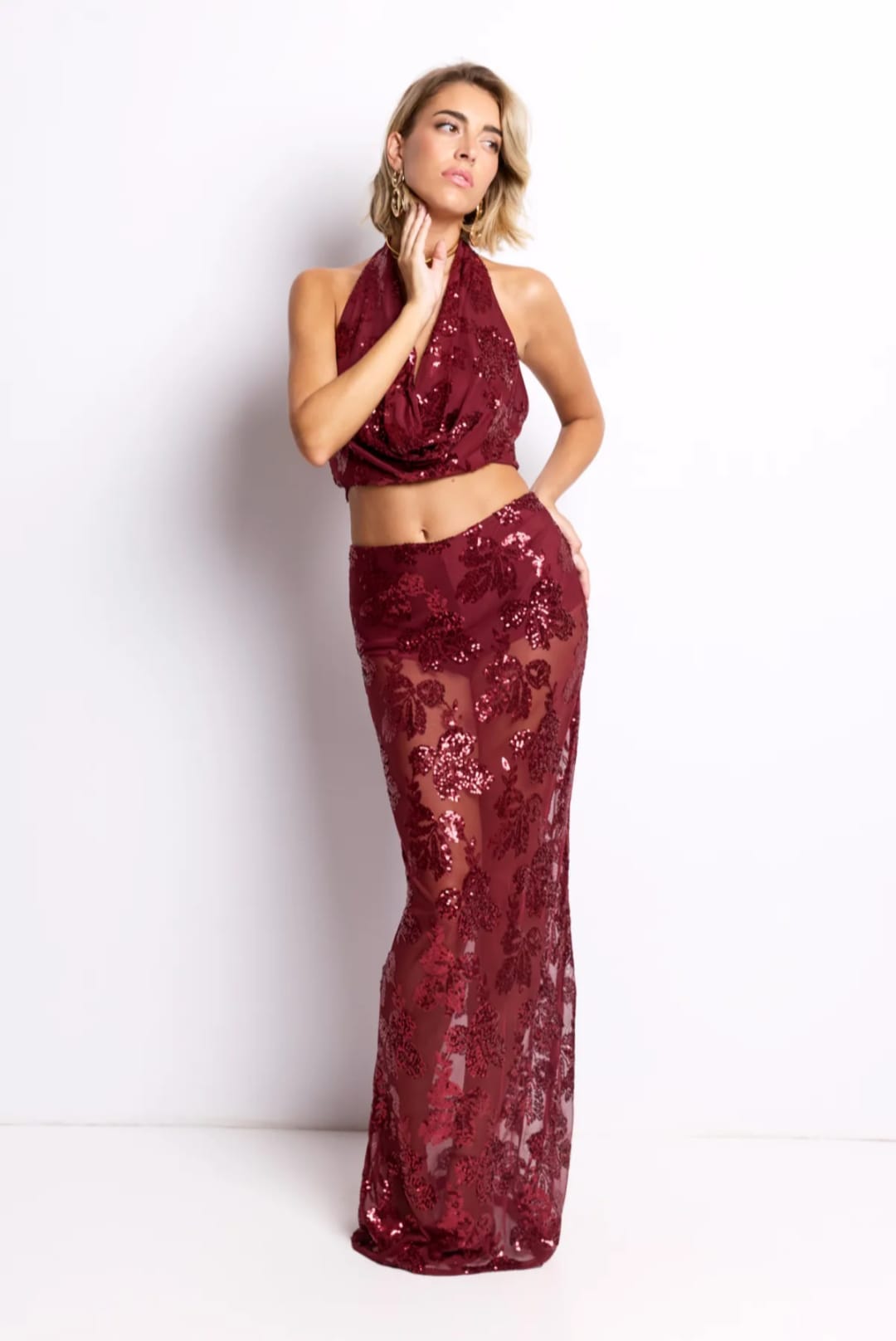 Conjunto de falda y top en tejido de tul con patrón de hojas en lentejuelas: falda con culote incorporado y top con tul y forro interior.