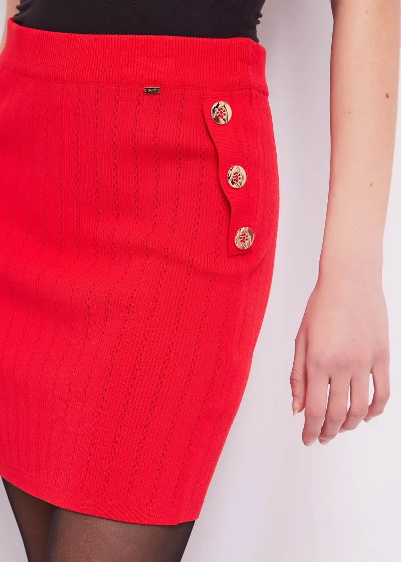 Falda en tejido punto perforado con cinturilla en goma y botonadura frontal vista.