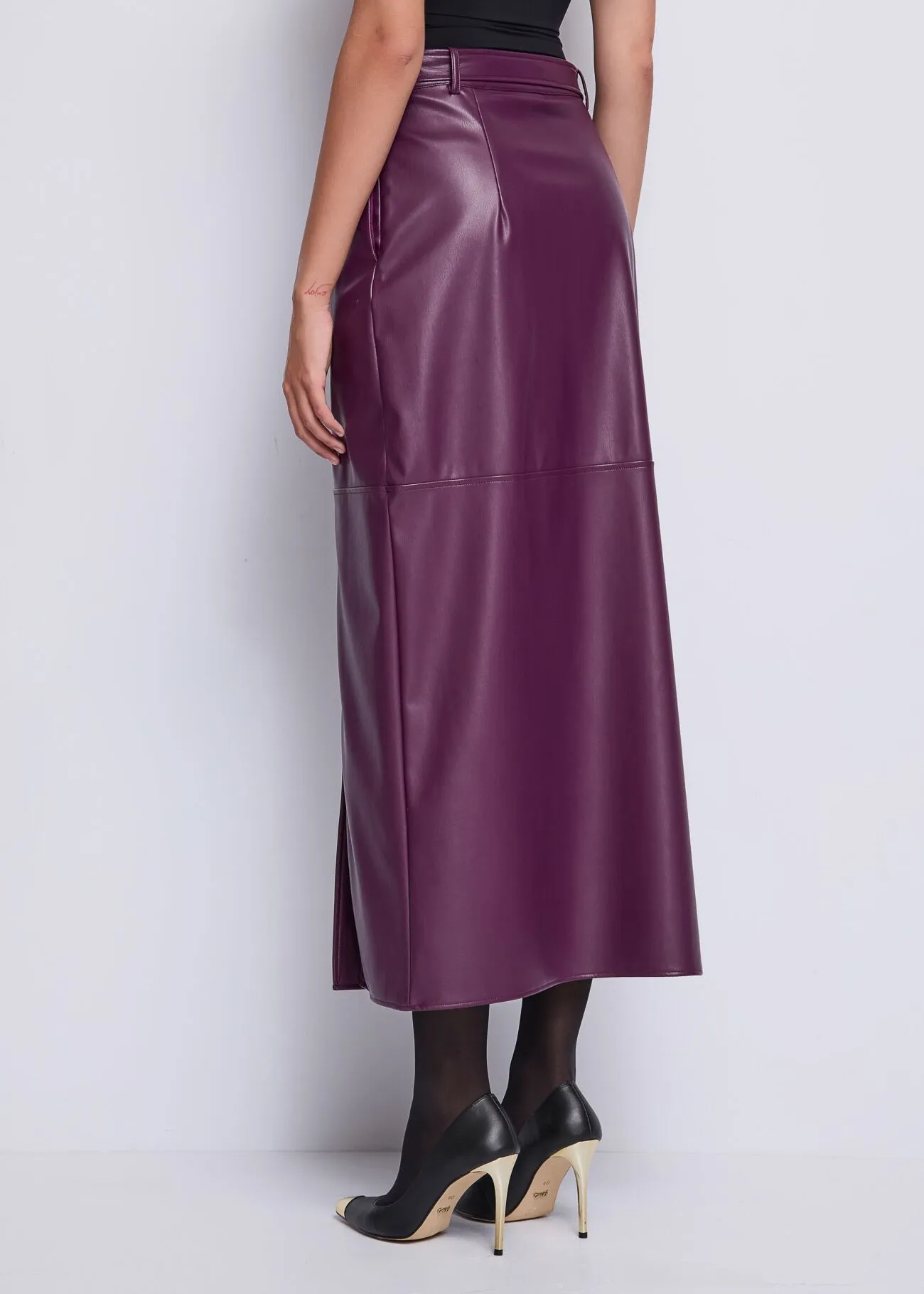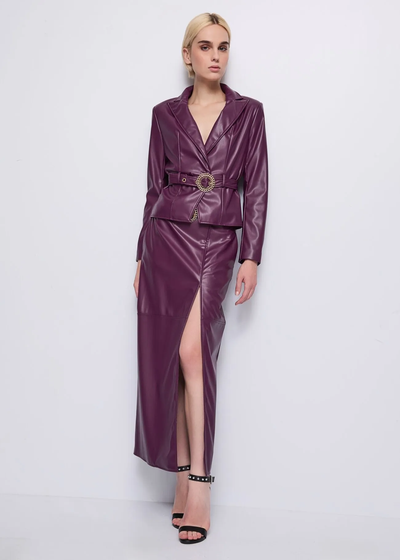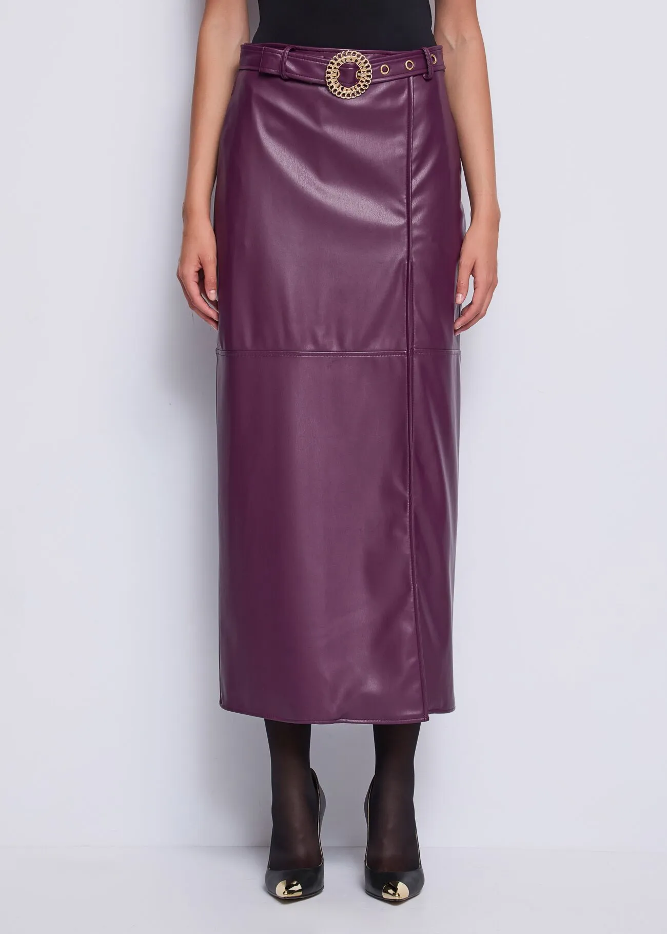 Falda en tejido eco piel con cinturón de hebilla decorativa y abertura frontal. Tejido sin elastano.