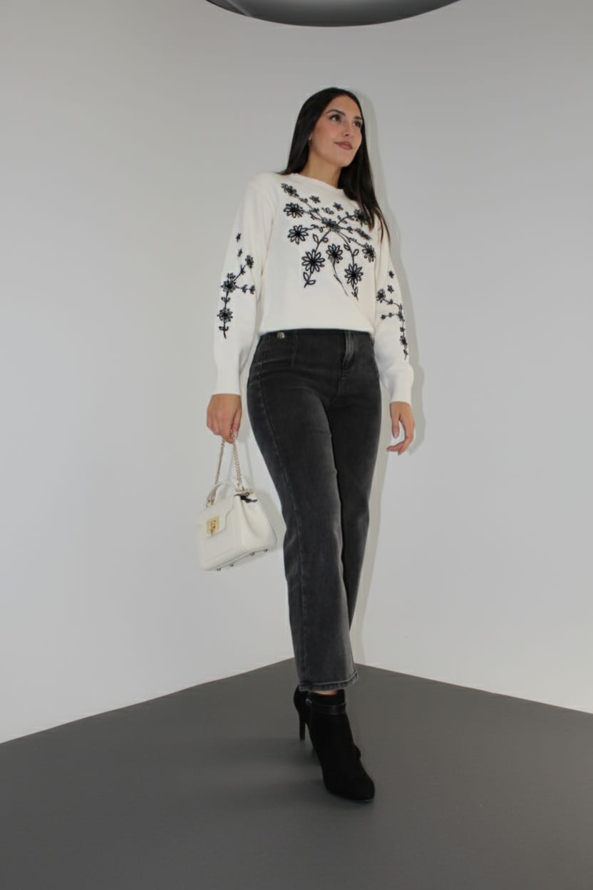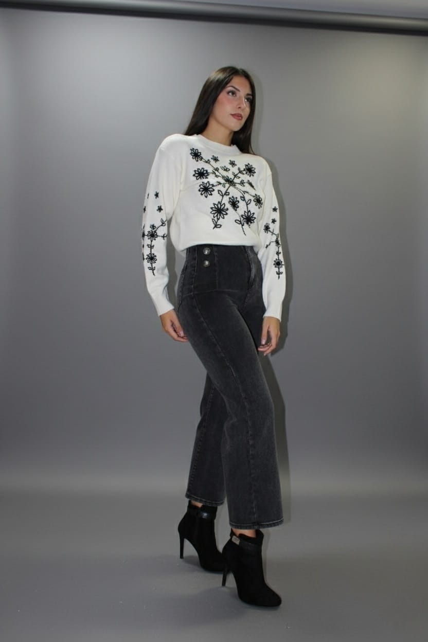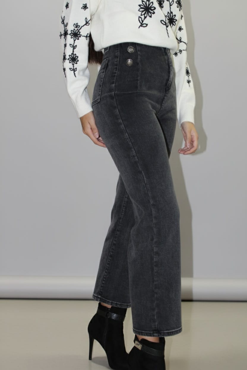 Jeans en tejido algodón jeans con elastano, tiro alto y botonadura vista frontal.