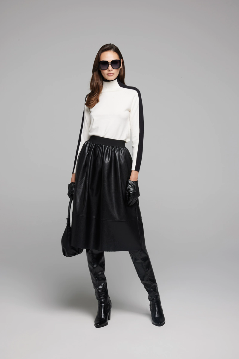 Jersey en tejido punto mezcla lana con cuello cisne. Fondo negro y líneas blancas.