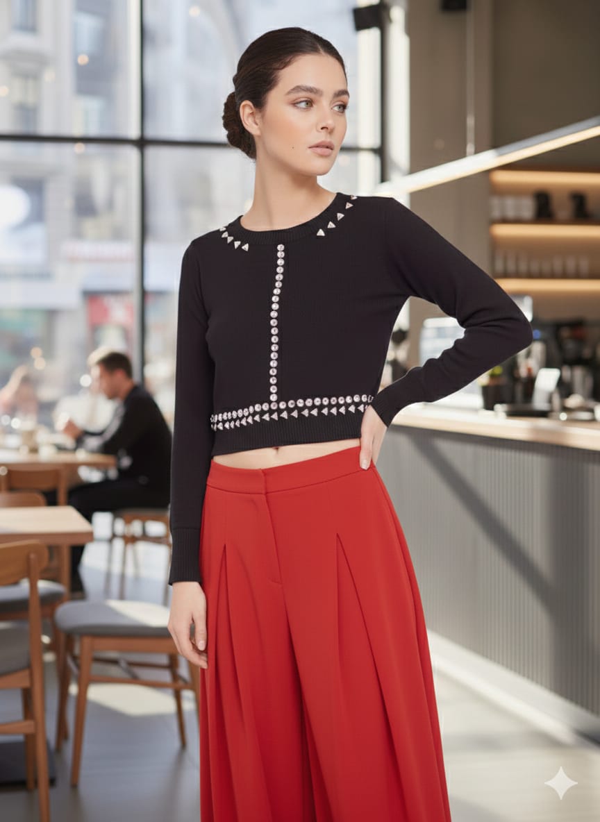 Jersey en tejido punto mezcla lana en corte crop con cristales decorativos frontales.