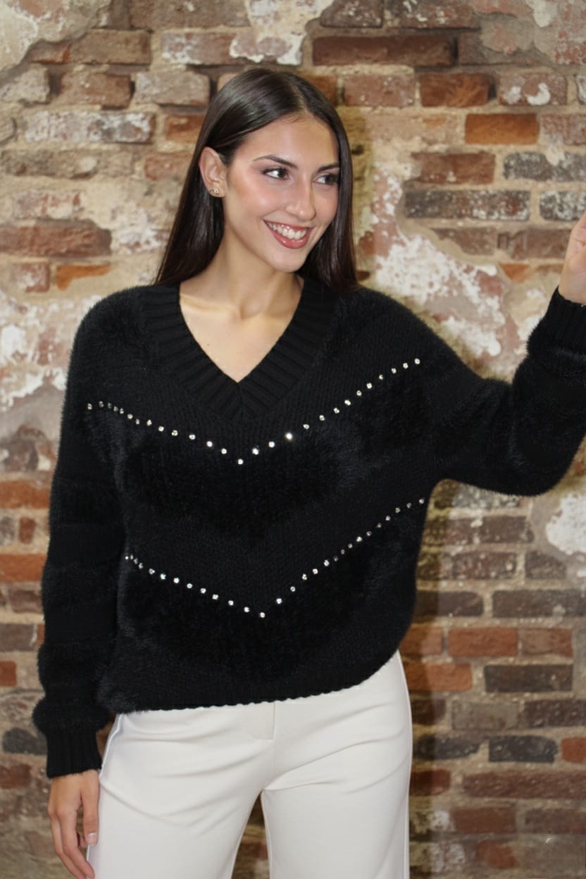 Jersey en tejido punto mezcla lana combinado con pelitos y cristales de imitación.