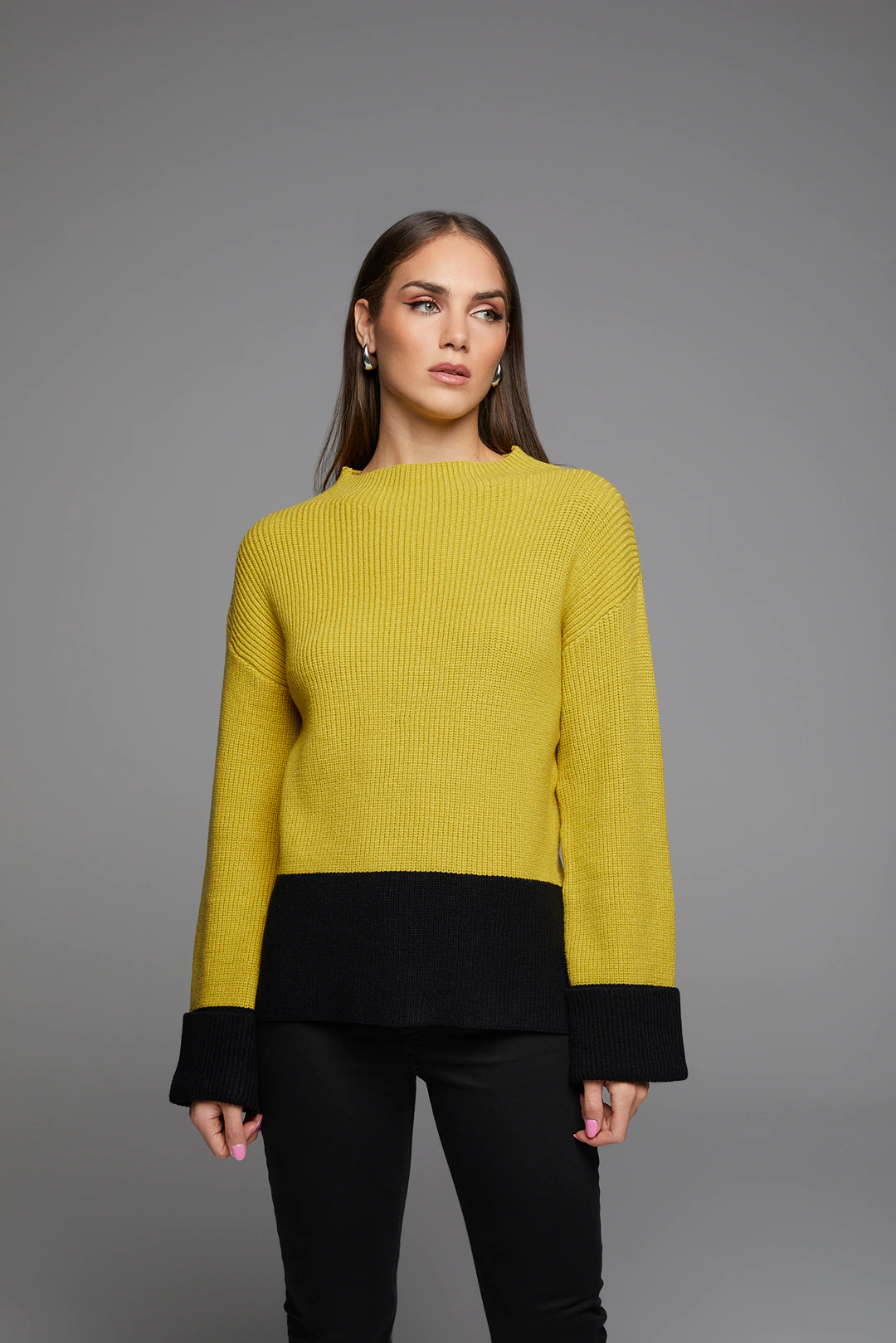Jersey en tejido punto mezcla lana con bajos a contraste, manga acampanadas y cuello semi cisne.