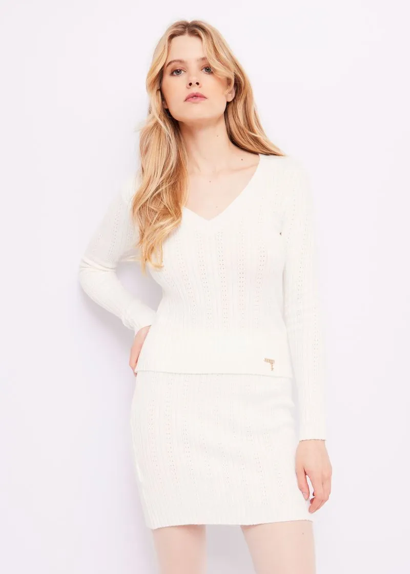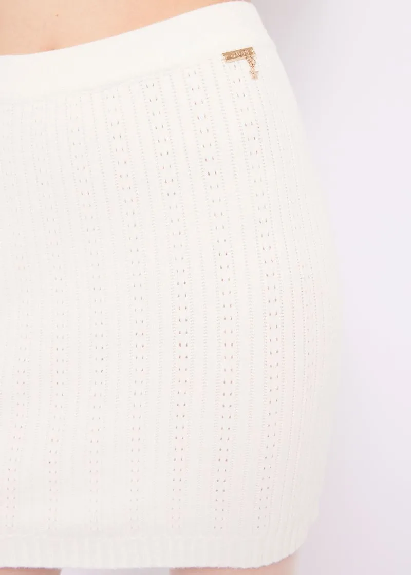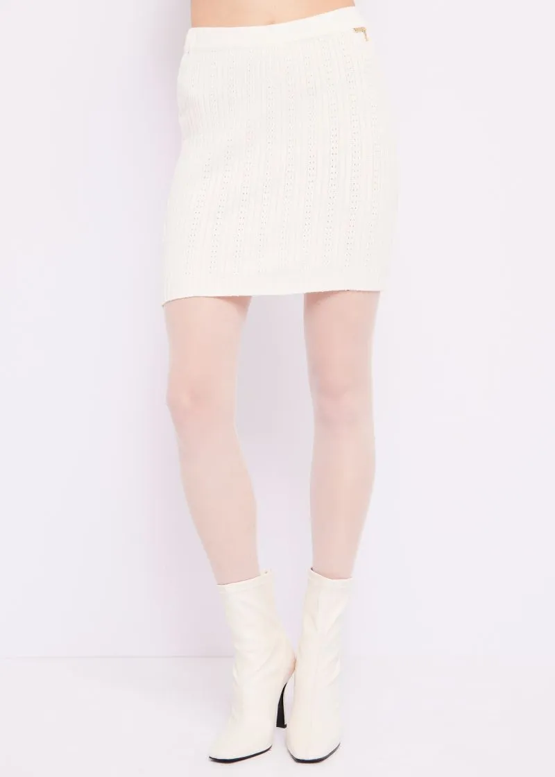 Minifalda en tejido punto mezcla lana con punto perforado en dibujo. Cinturilla en goma.