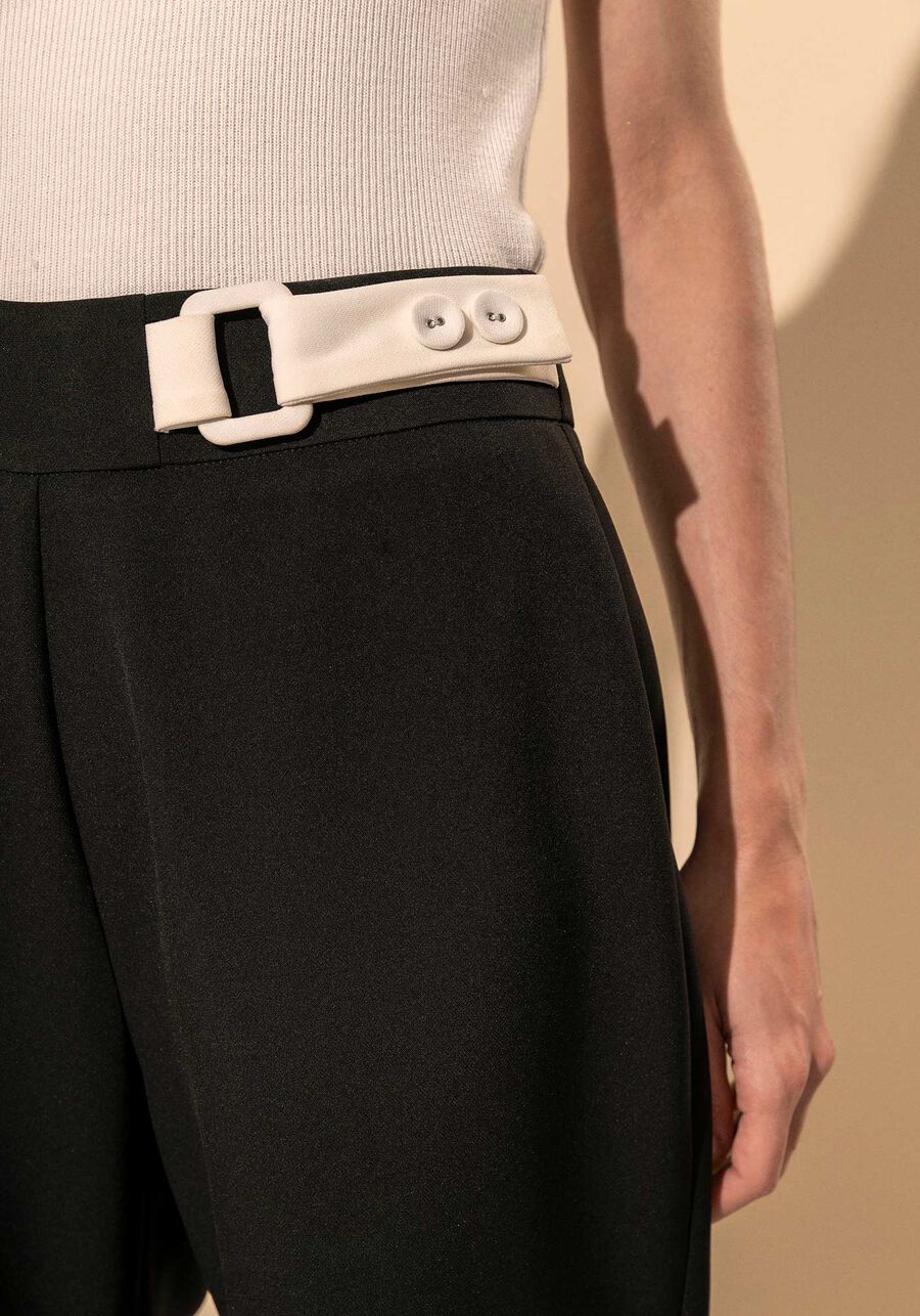 Pantalón en tejido crepe con elastano con tiro alto, detalle de cierre a contraste de color.