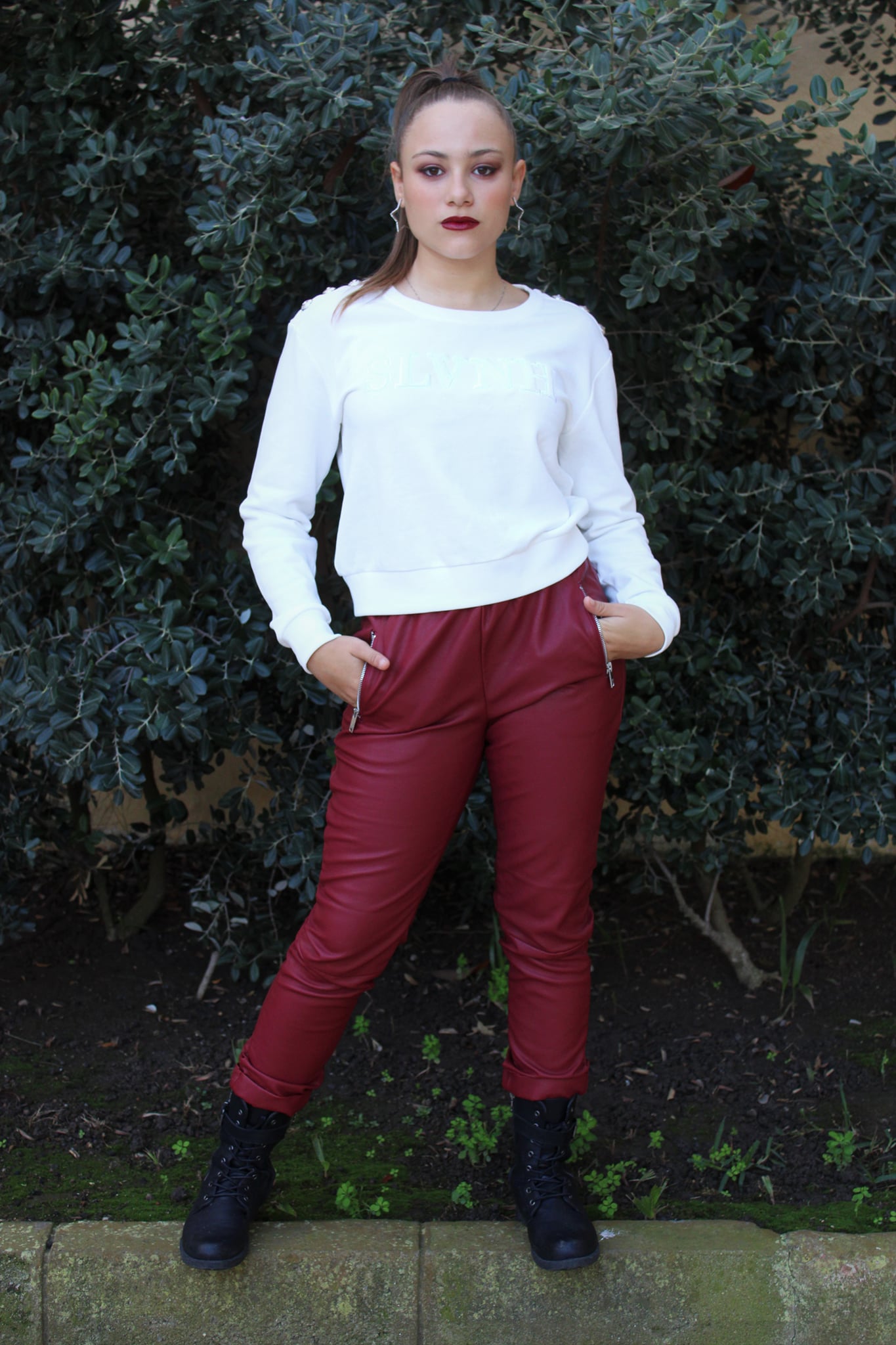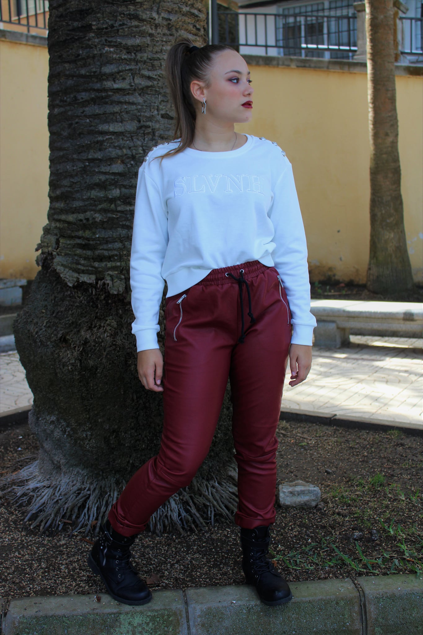 Pantalón en tejido eco piel con cinturilla en goma y bajo en goma.