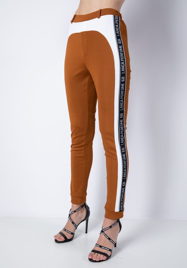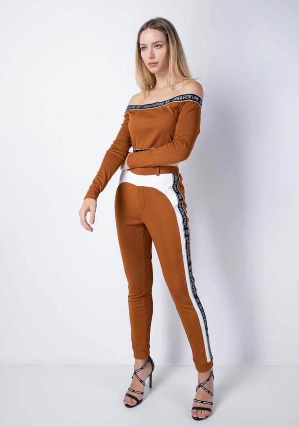 Pantalón en tejido punto rayado con letras en logo en laterales y bajo vuelto.