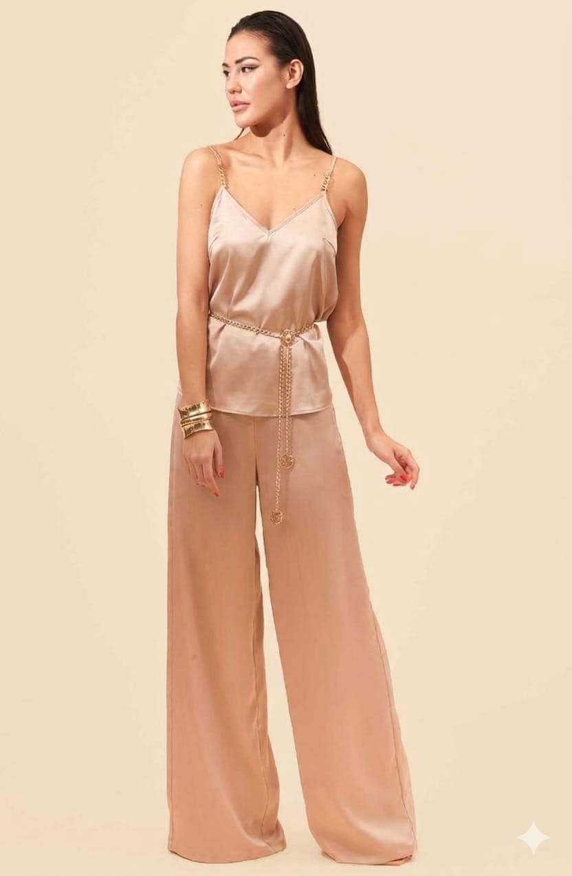 Top en tejido satinado con detalle en cadena en los tirantes.