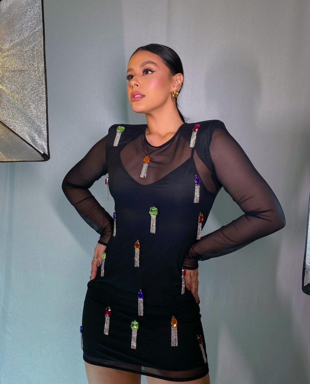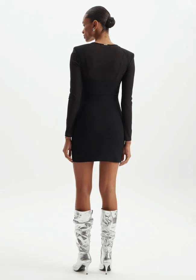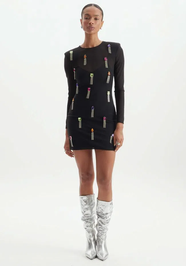 Vestido en tejido punto interior y tul con elastano exterior con colgantes decorativos frontales.