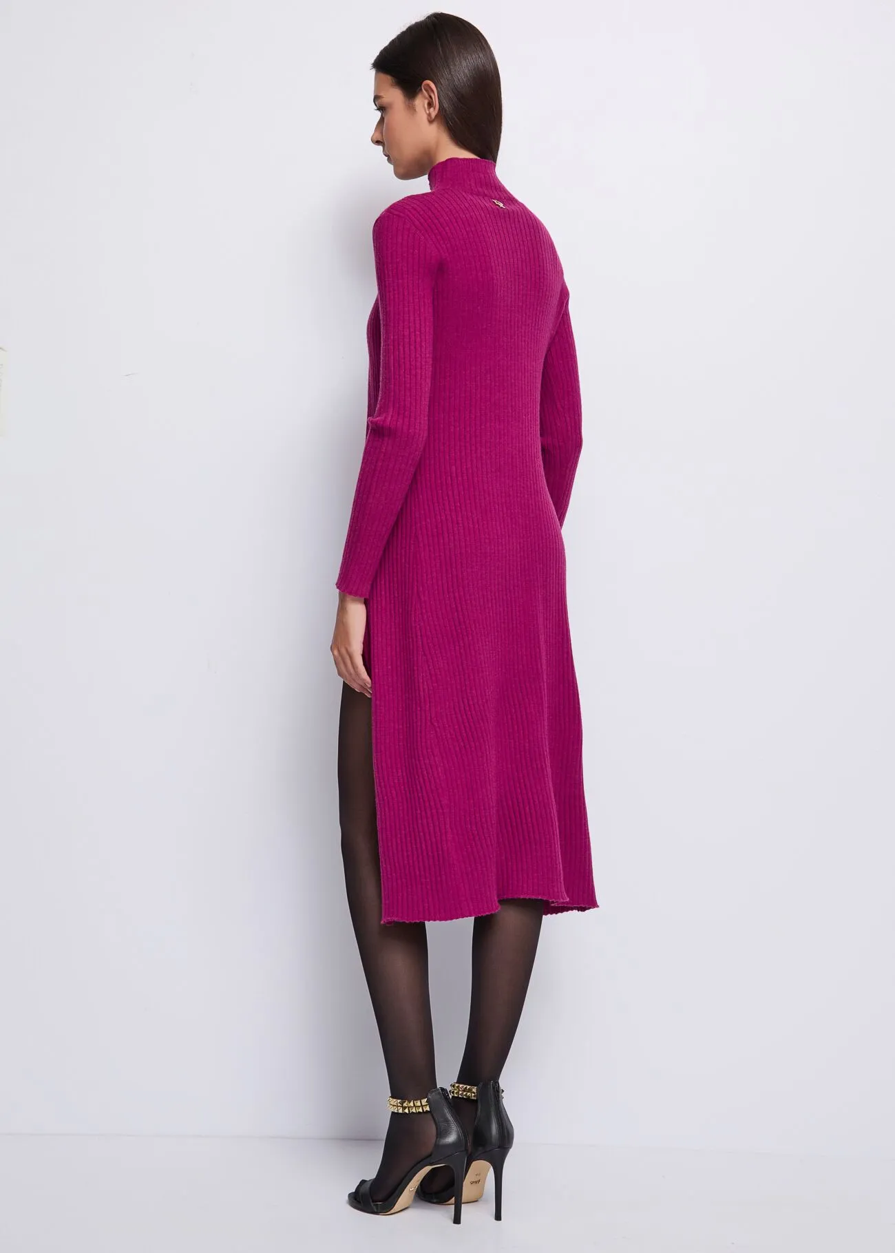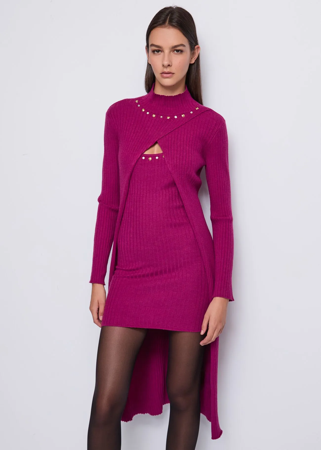 Vestido y cardigán en tejido de punto canalé. Vestido con tirante ancho y detalle de tachas y cristales en el pecho. Cardigán con cuello cisne y corte cruzado, detalle de tachas y cristales en el cuello.