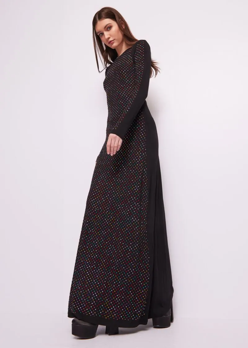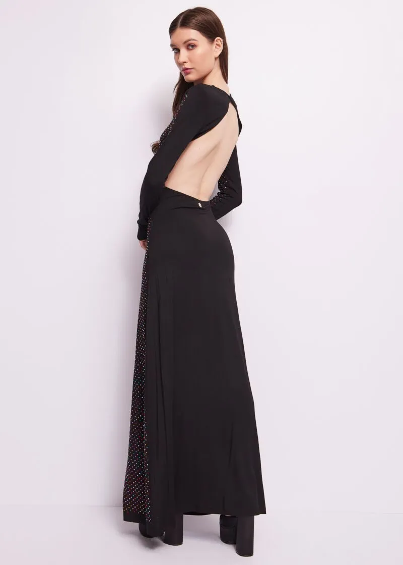 Vestido en tejido algodón con elastano con parte frontal en cristales de colores y parte trasera con abertura en espalda.