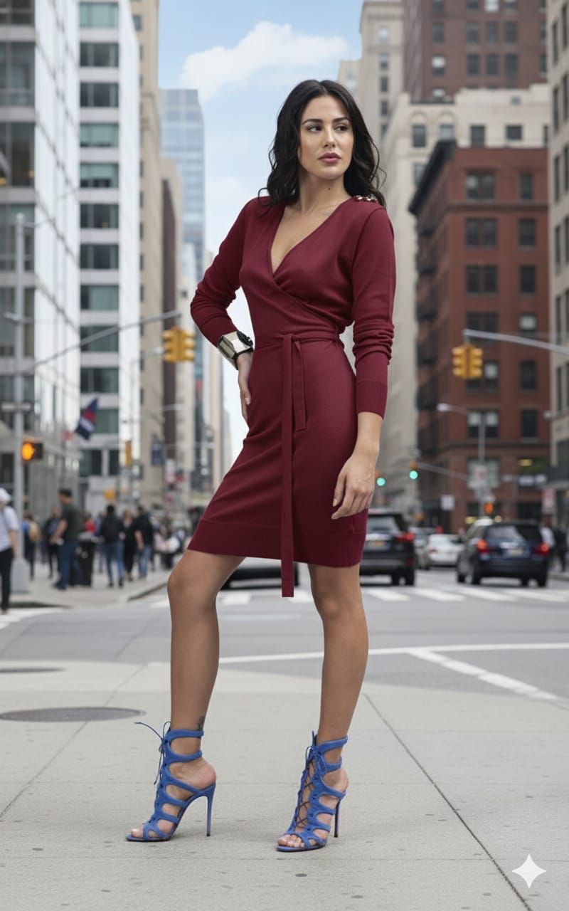 Vestido en tejido de punto, escote cruzado y anudado en el lateral. Cristales decorativos en los hombros.