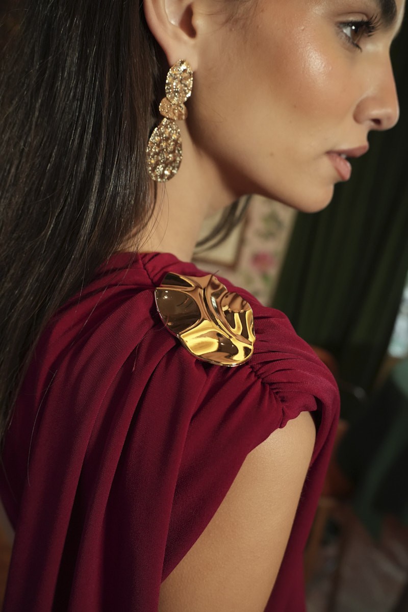 Vestido en tejido punto en seda con drapeado frontal, lazada decorativa en hombro y detalle metalizado. Abertura frontal.