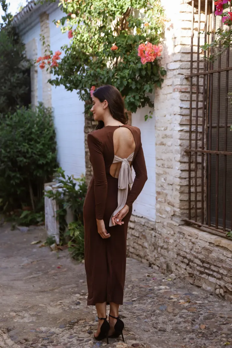 Vestido en tejido de punto con forro interior, corte midi y escote cerrado. Espalda abierta con lazo decorativo a contraste. Cierre con cremallera invisible trasera.