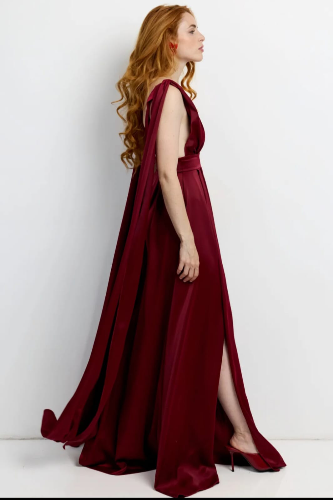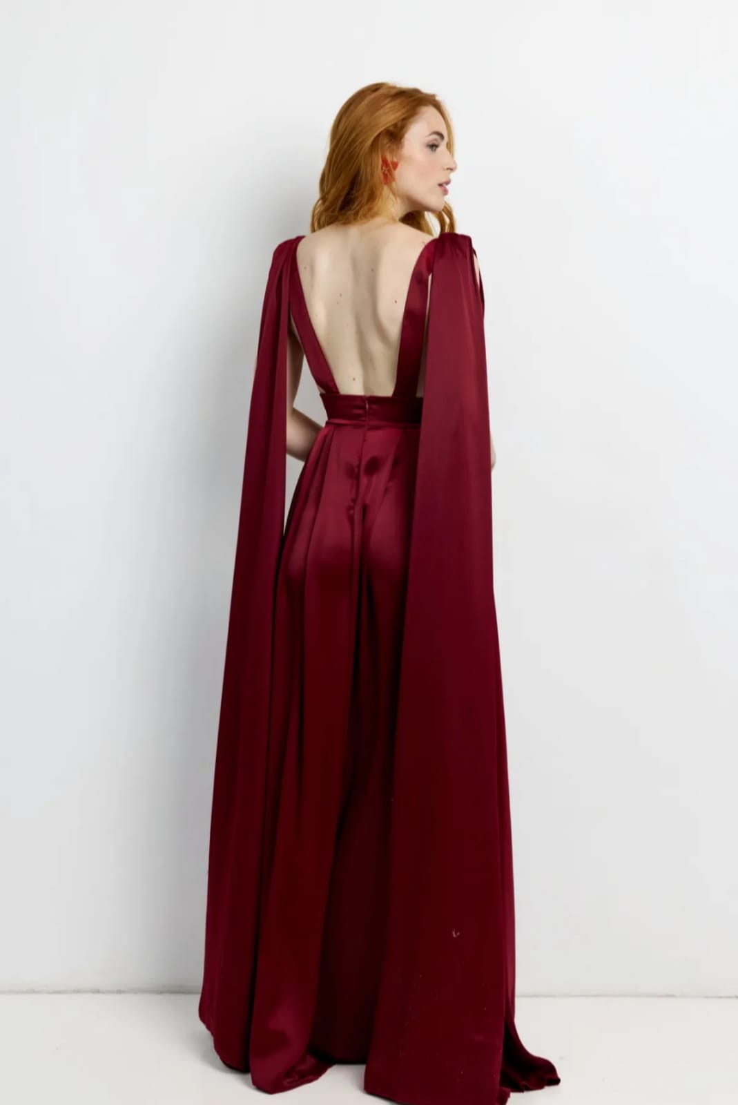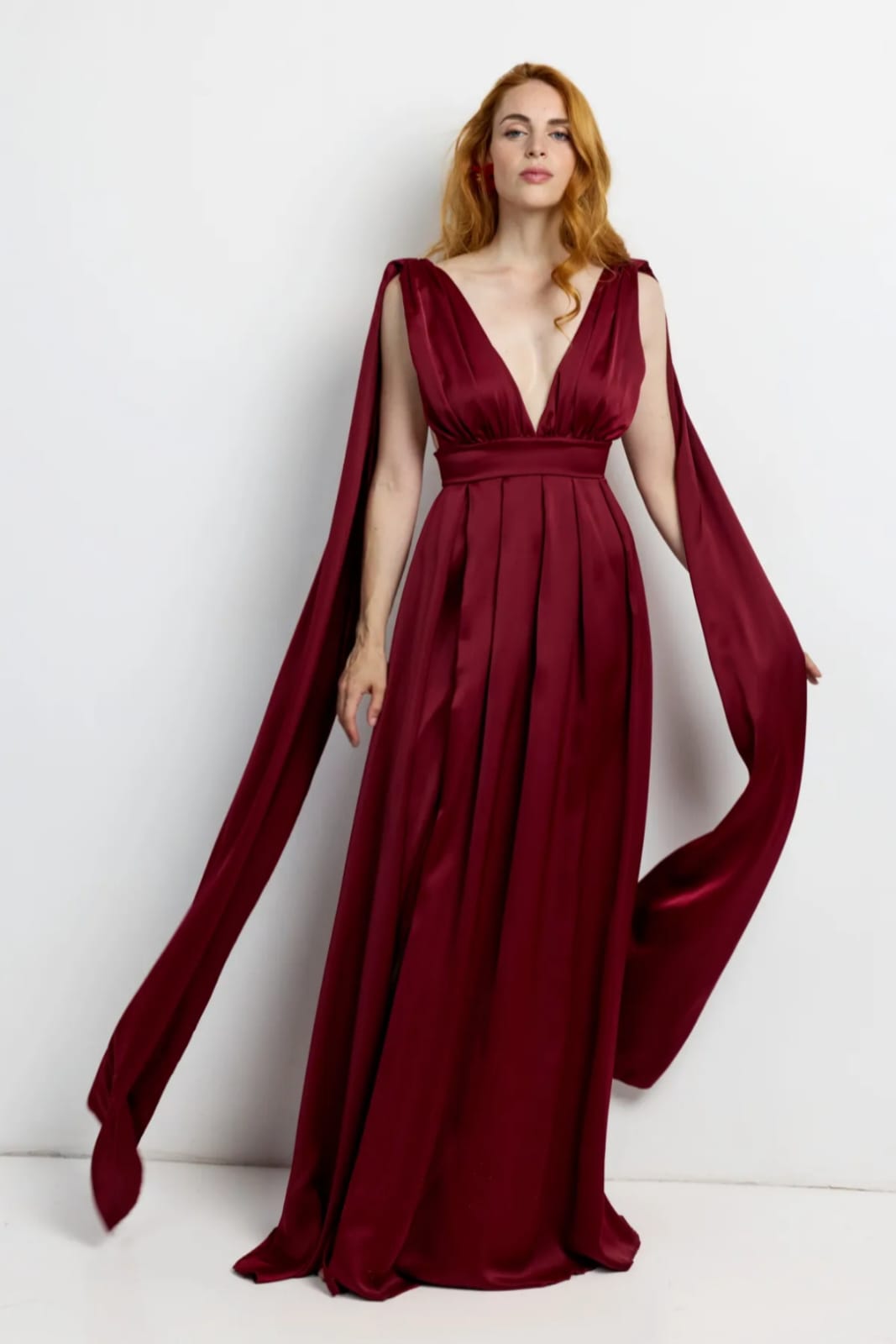 Vestido en tejido satinado con escote en «V» y lazos en hombros.