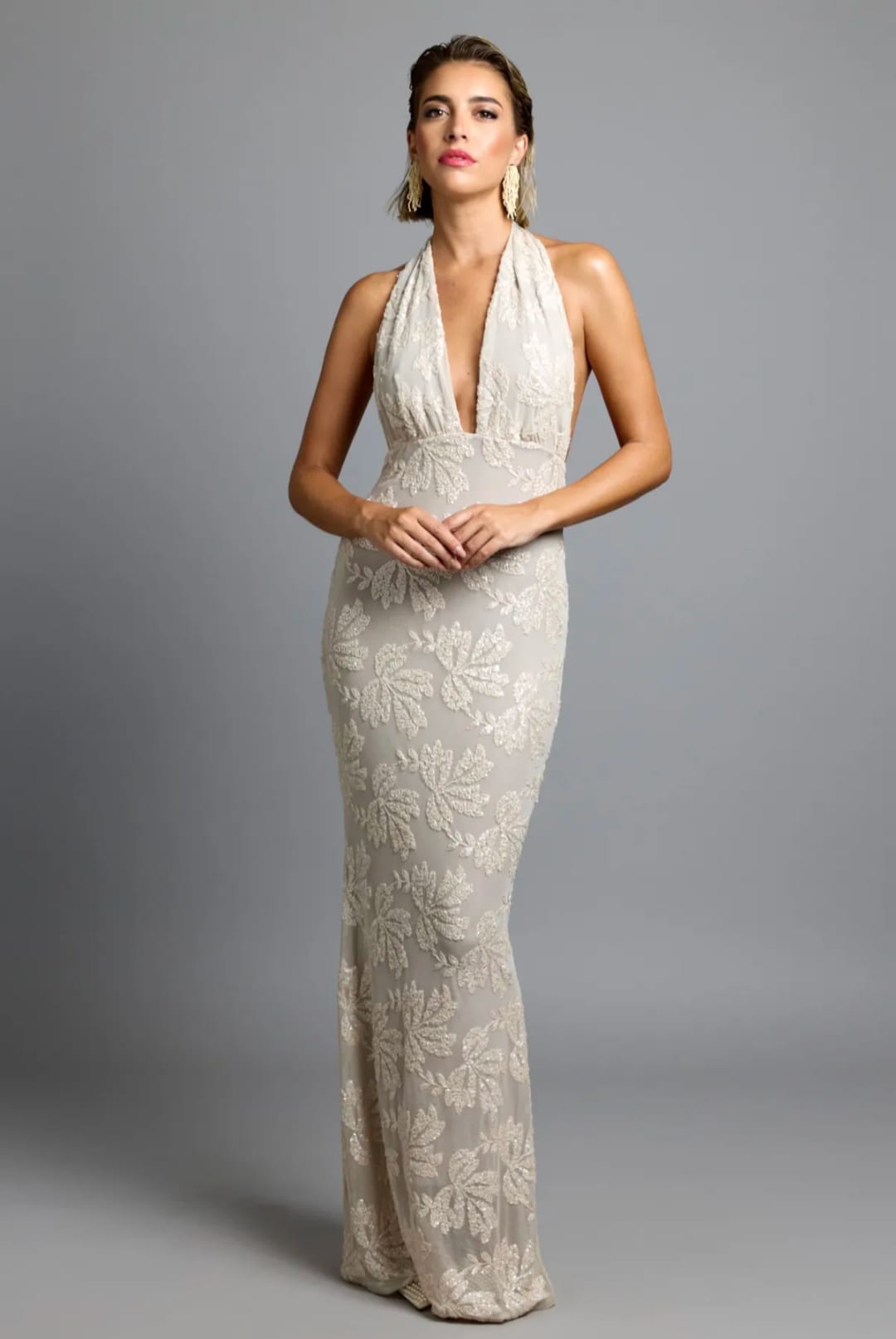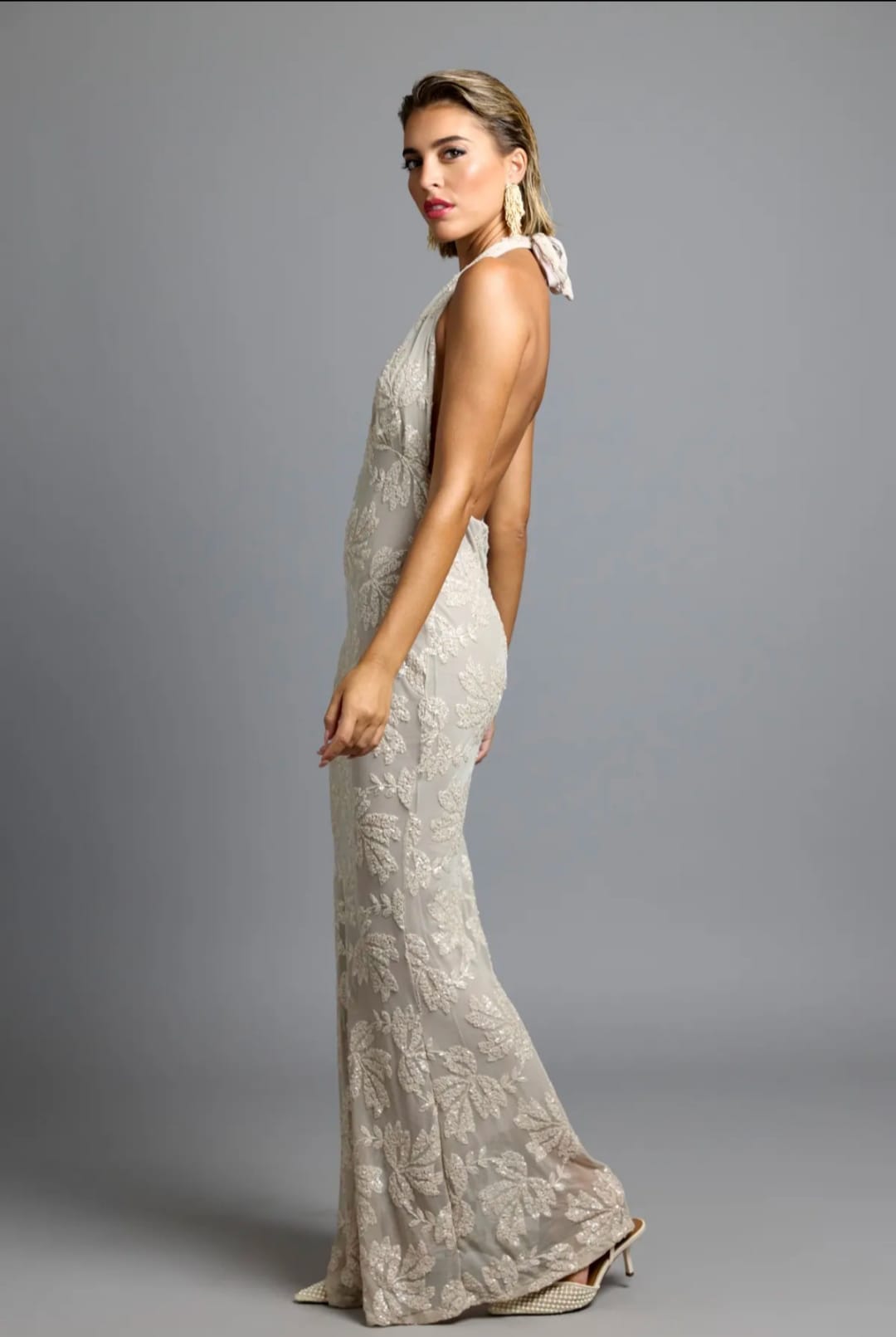Vestido en tejido de tul con patrón de hojas en lentejuelas, escote en V y anudado al cuello. Forro interior.