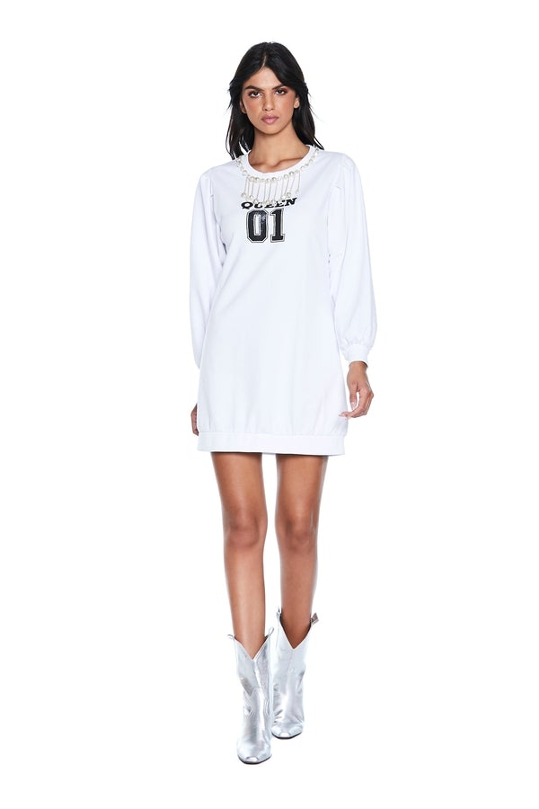 Vestido en tejido algodón felpa con mínimo elastano y detalles en cuello decorativos.