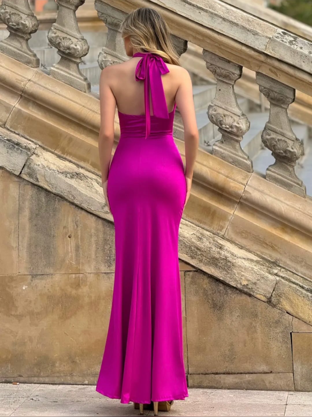 Vestido en tejido punto satinado con cuello halter, drapeado frontal y abertura.