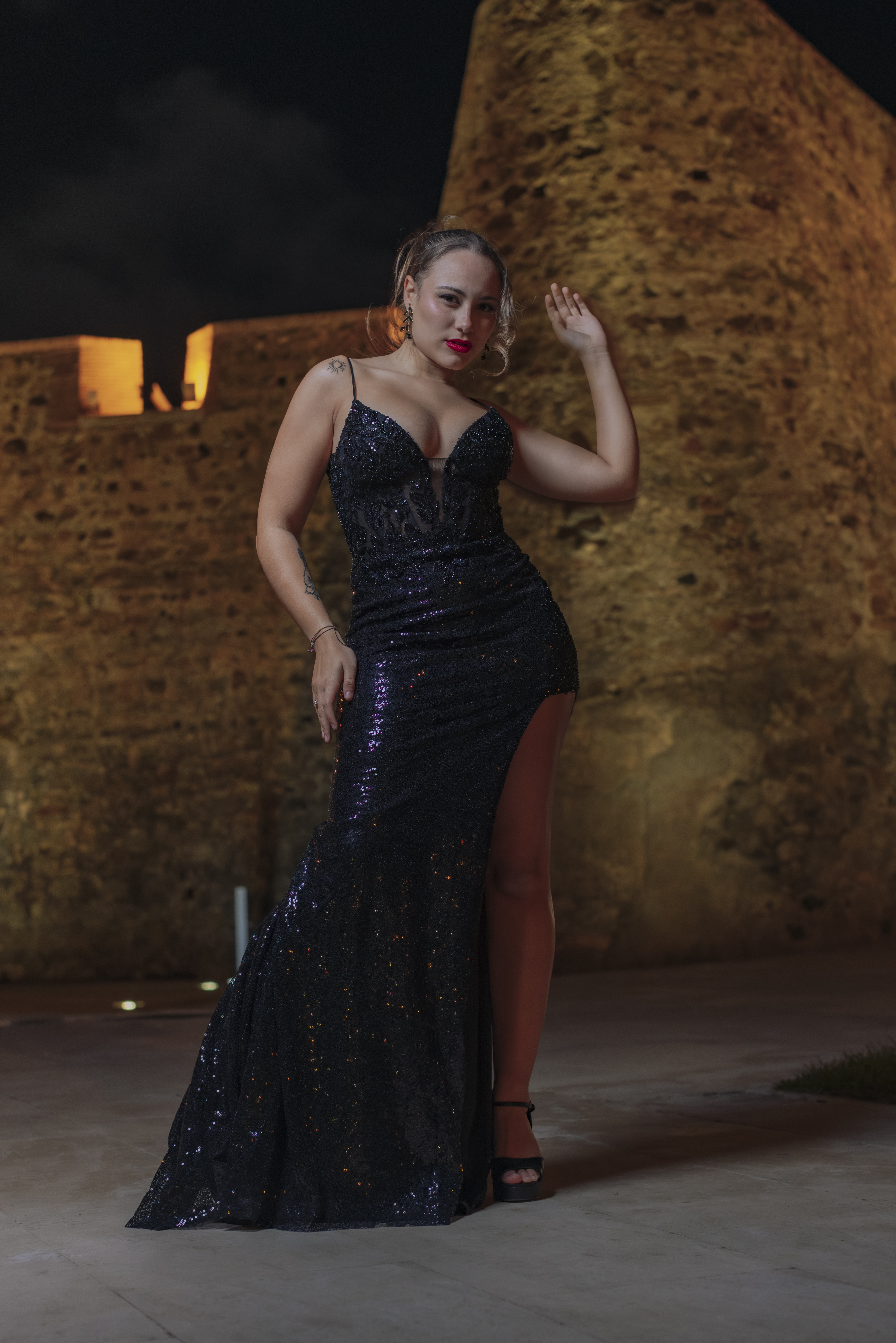 Vestido en tejido malla interior con licra y exterior en lentejuelas con abertura en pierna y espalda para ajustar.