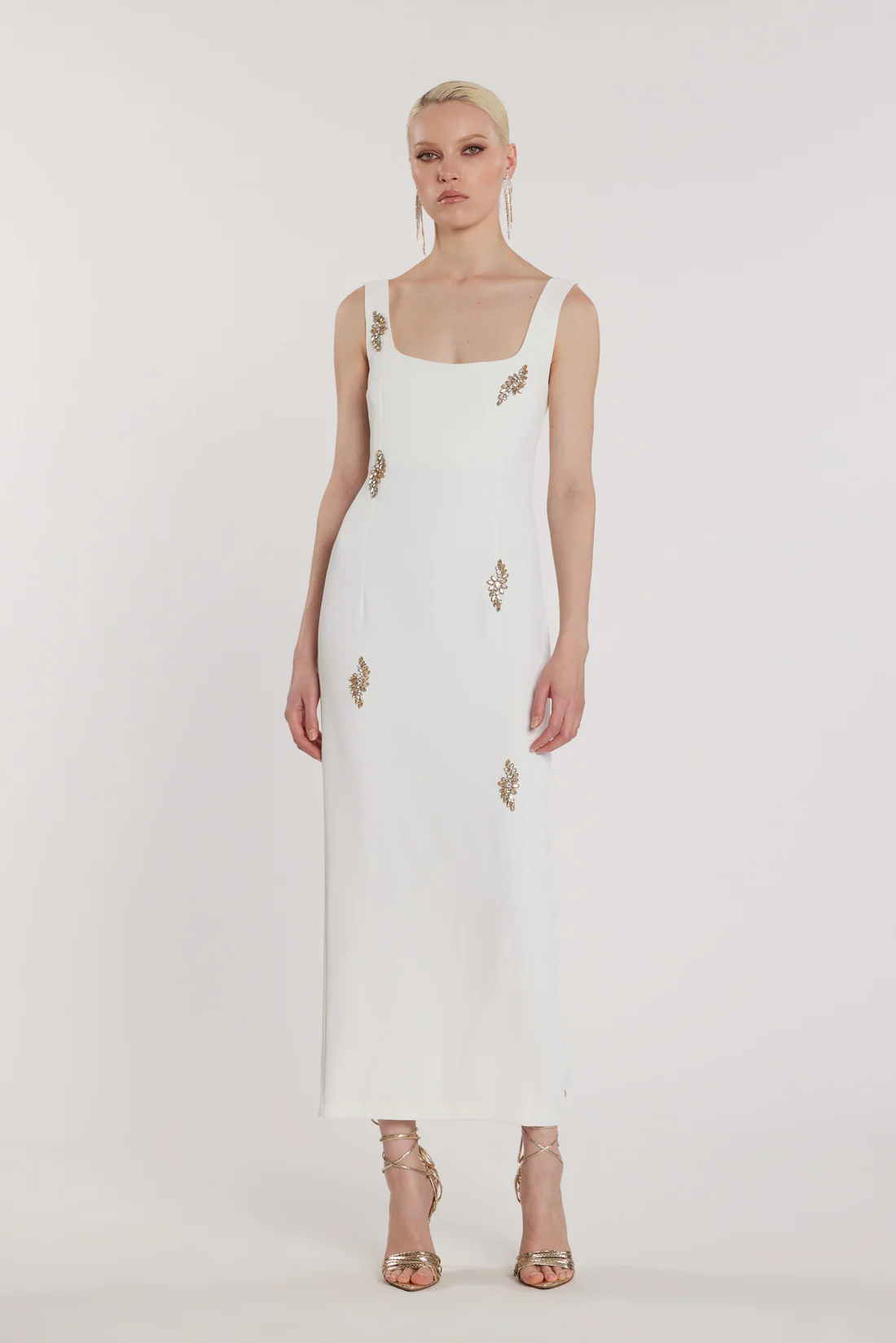 Vestido en tejido crepe con elastano con detalles en cristal frontales.