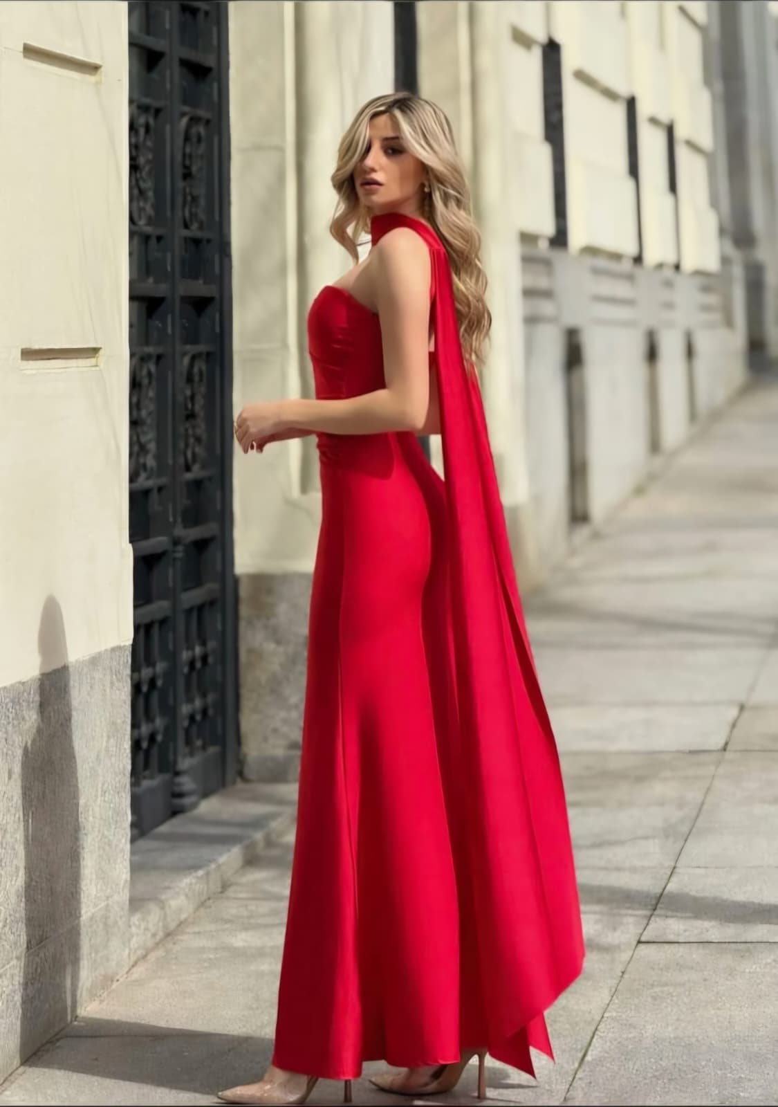 Vestido en tejido de licra con escote palabra de honor y lazada al cuello.
