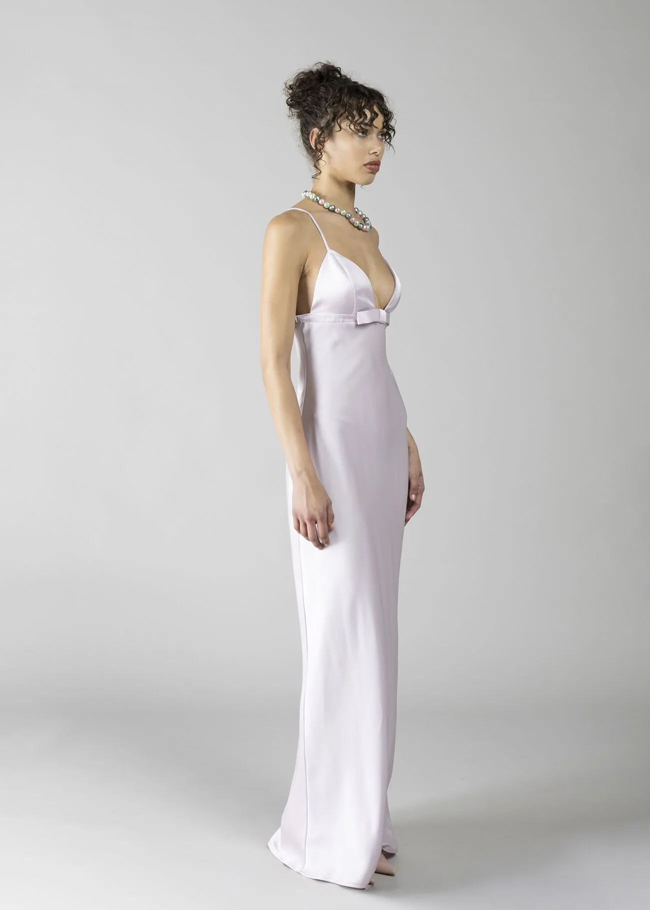 Vestido en tejido satinado con lazo decorativo debajo del pecho. Abertura en el lateral del bajo, espalda con elástico y tirantes regulables.