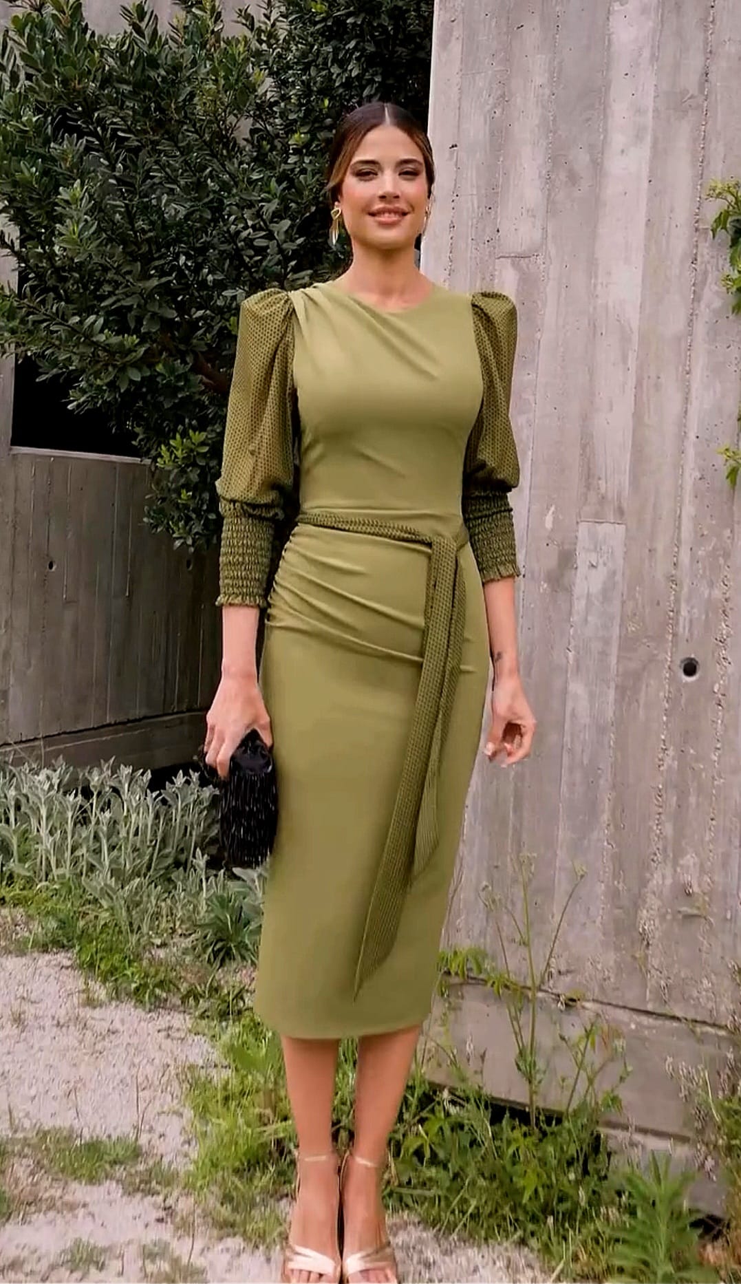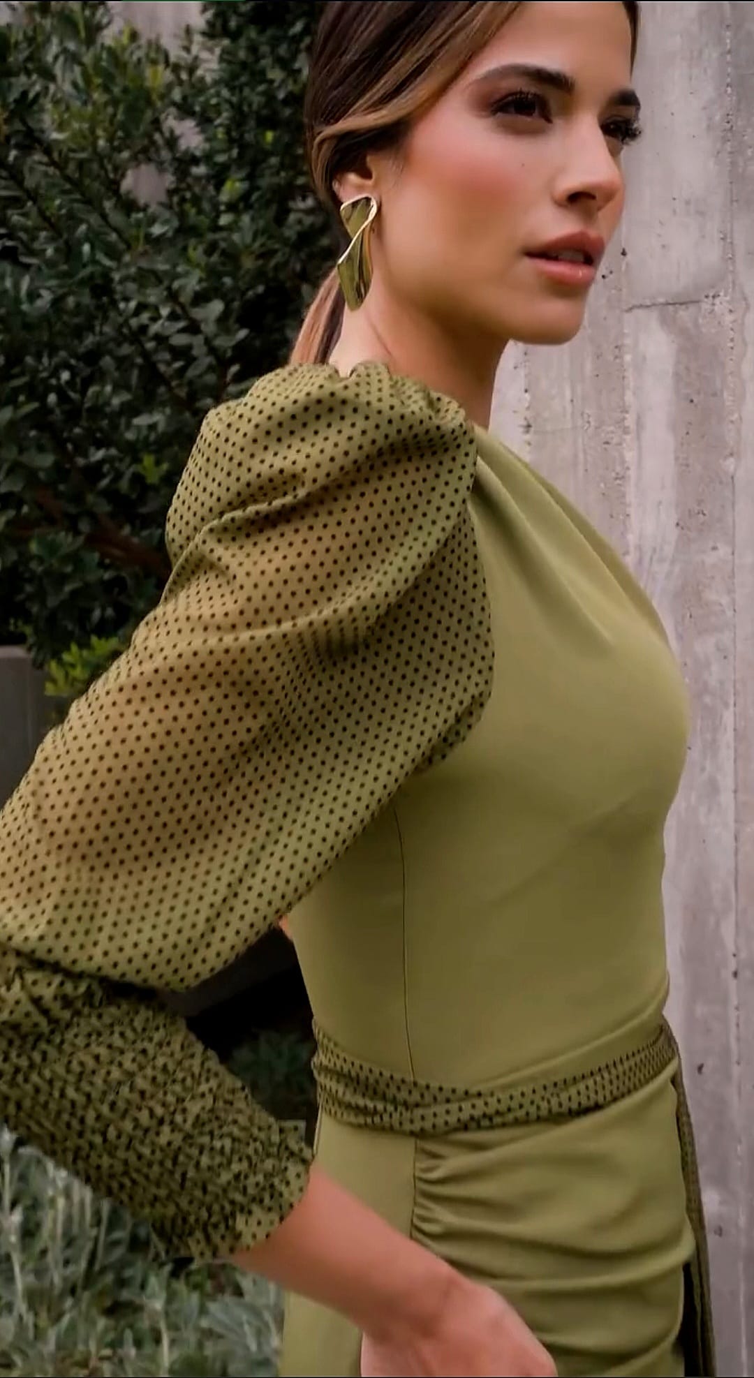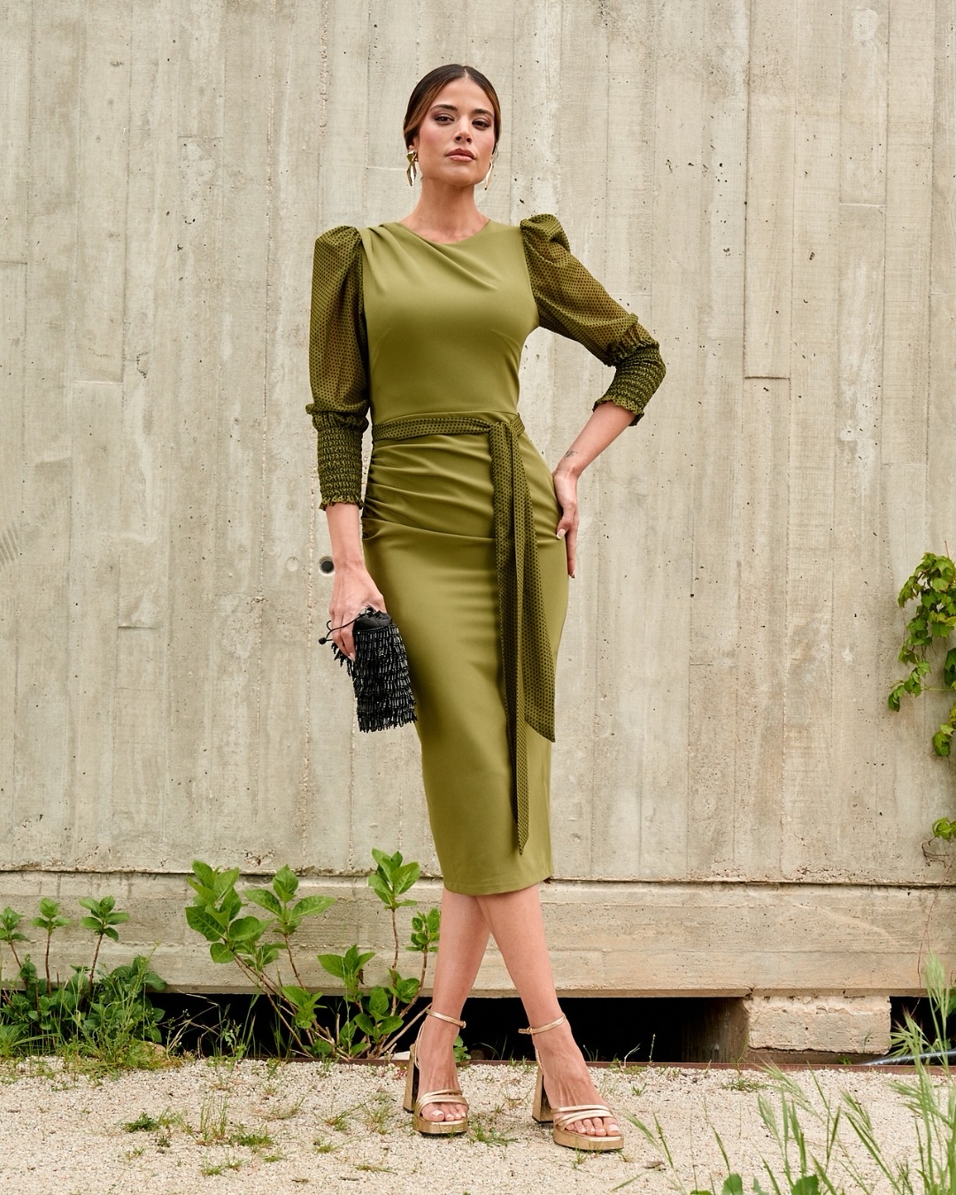 Vestido en tejido de crepe con mangas en plumeti terciopelo. Cinturón del mismo tejido de gasa a contraste. Cierre con cremallera invisible en la espalda.