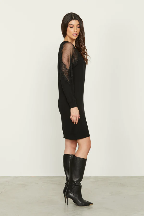 Vestido en tejido punto mezcla lana con mangas bordadas en plumeti.