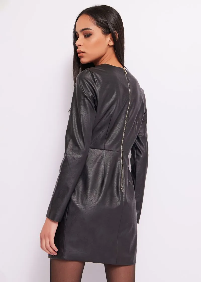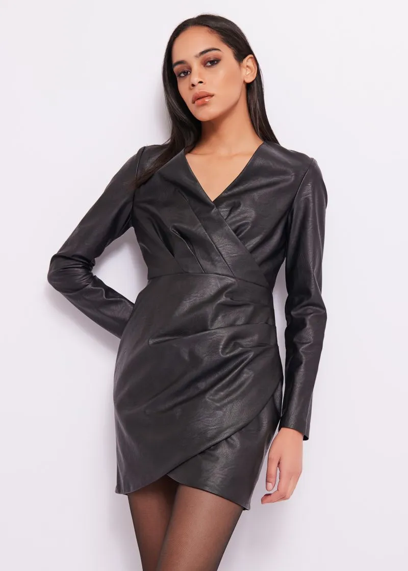 Vestido en tejido eco piel con mínimo elastano con plisados frontales decorativos.