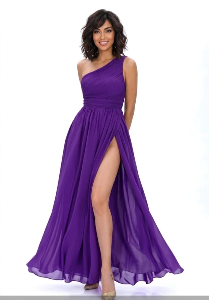 Vestido en tejido gasa plisada en parte superior con corte simétrico y bajo en vuelo con abertura frontal.
