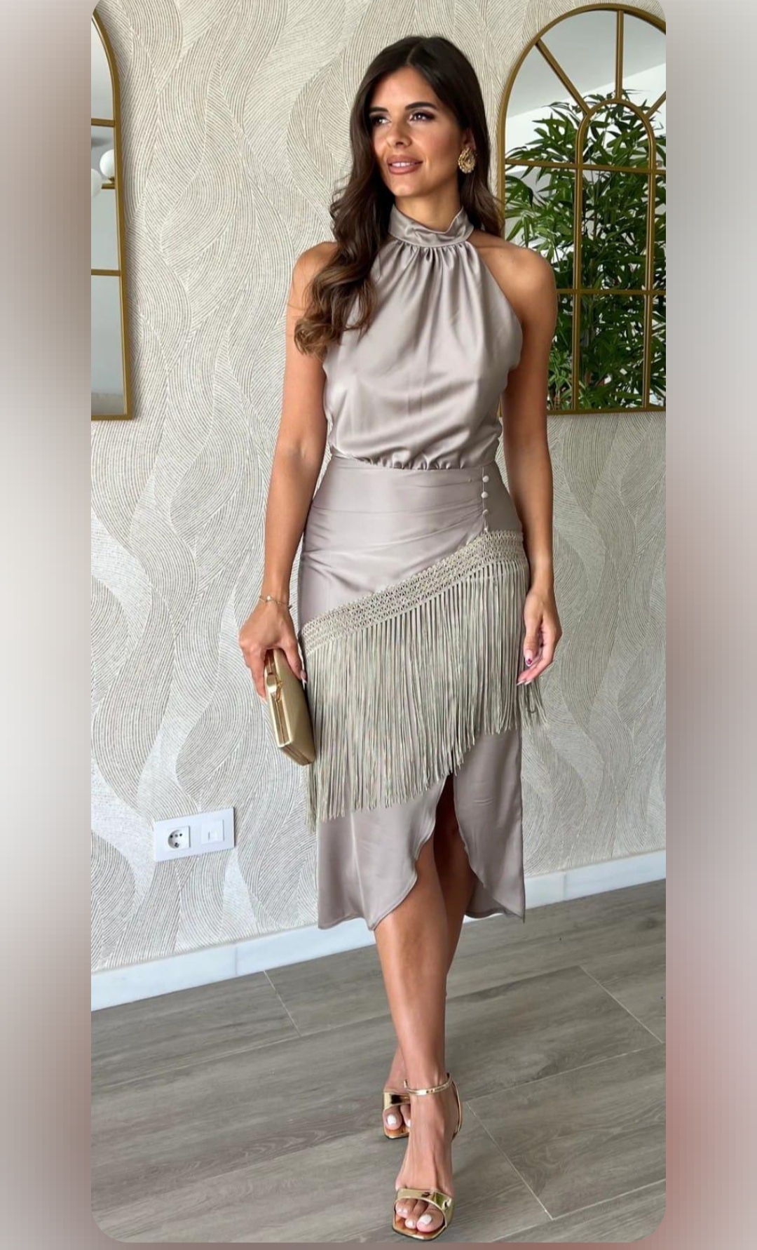 Vestido en tejido satinado con elastano con cuello halter, drapeado frontal y flecos decorativos.