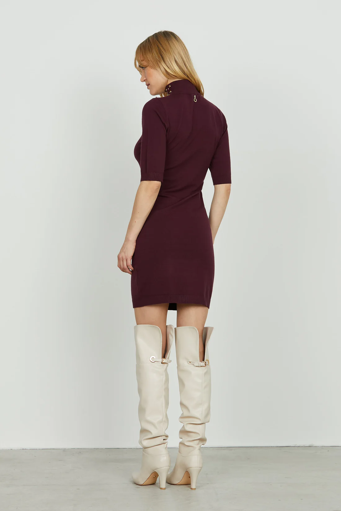 Vestido en tejido punto mezcla lana con detalles en tachas frontales y abertura frontal.
