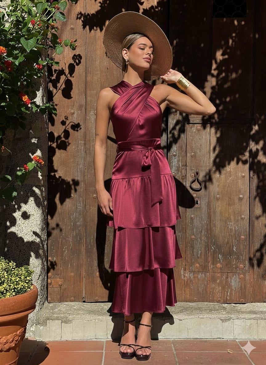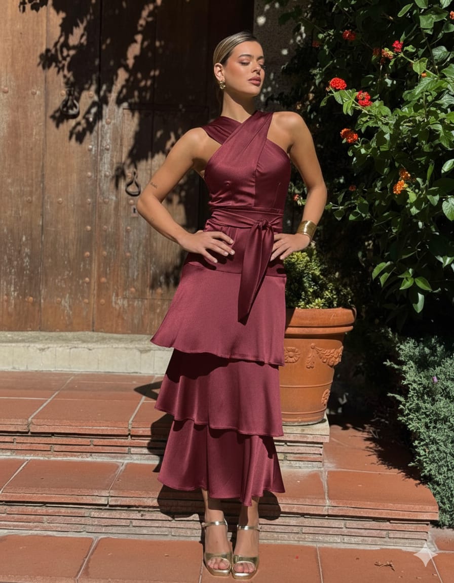 Vestido en tejido crepe satinado con elastano con corte cruzado en parte superior y volantes en parte inferior. Lazada para ajustar en cintura.
