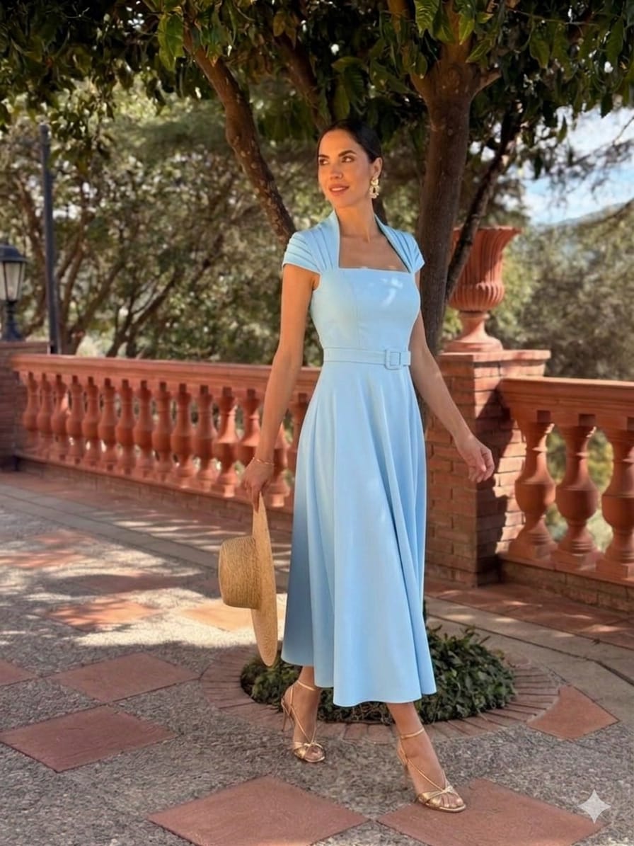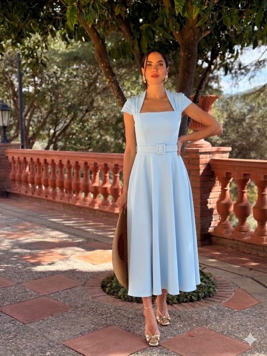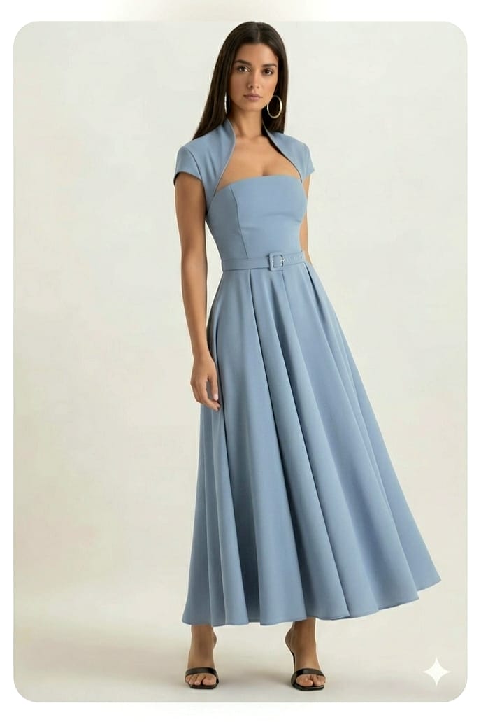 Vestido en tejido crepe con elastano con corte corsé superior y corte en bajo vuelo. Cinturón para ajustar.
