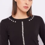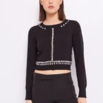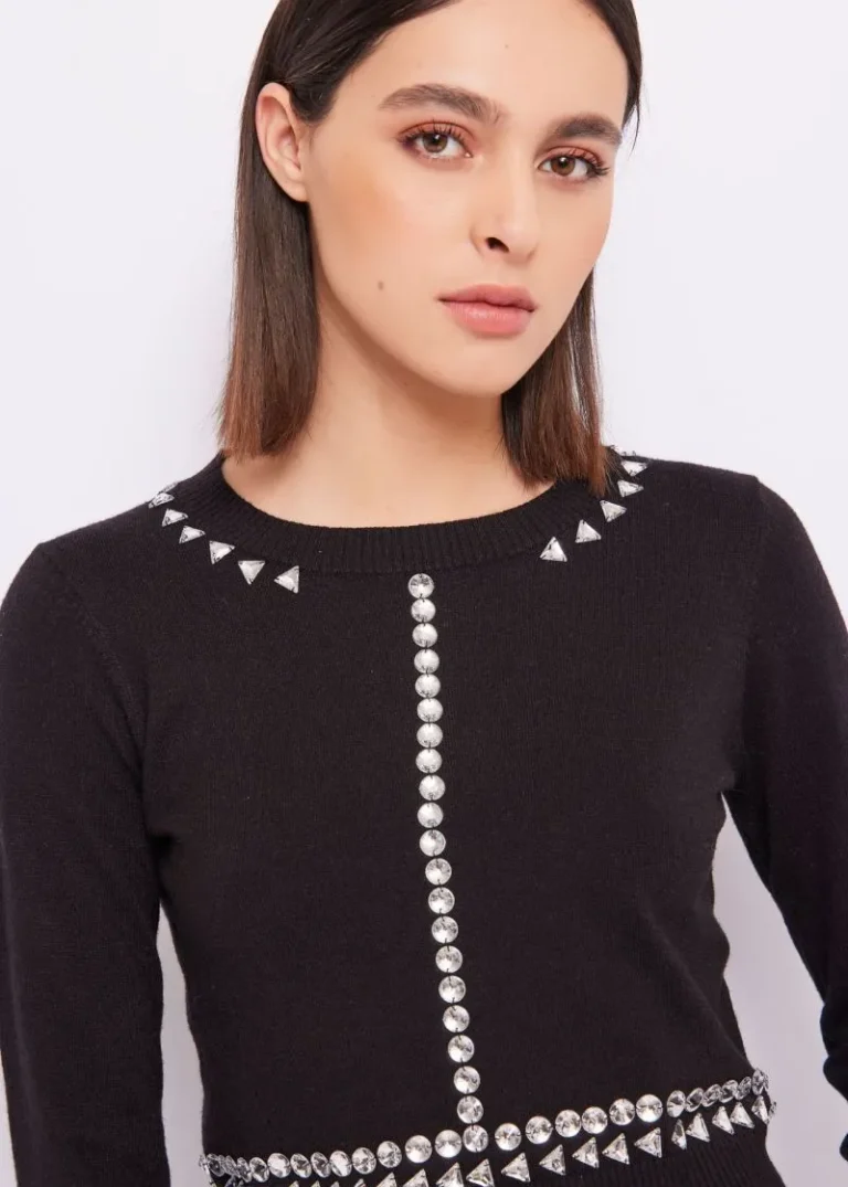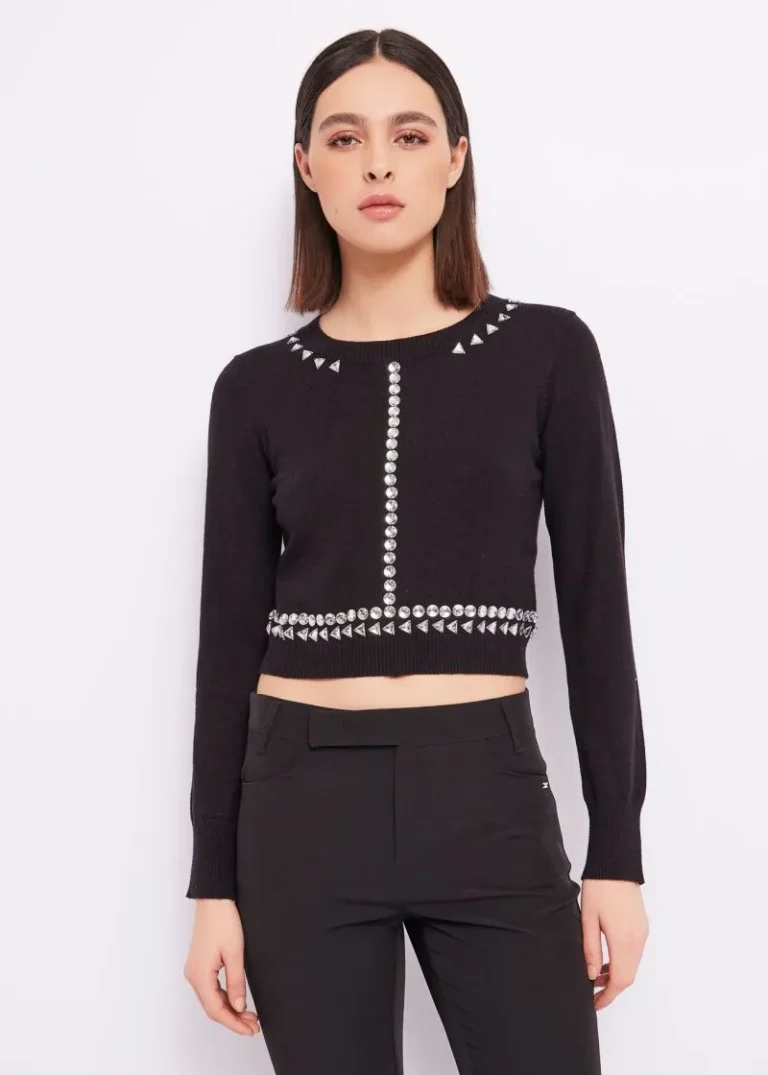 Jersey en tejido punto mezcla lana en corte crop con cristales decorativos frontales.