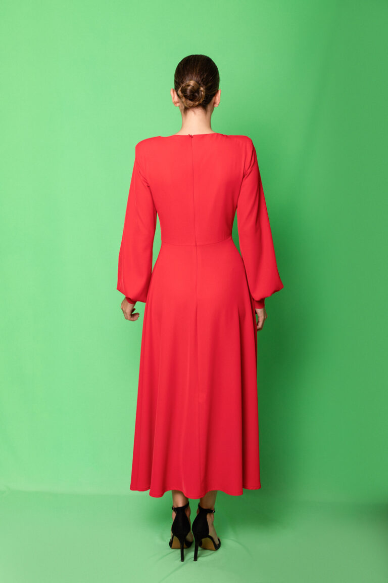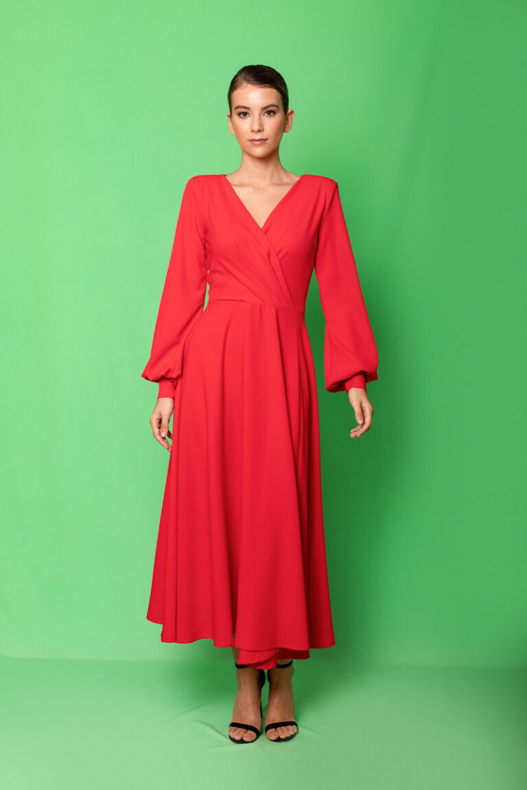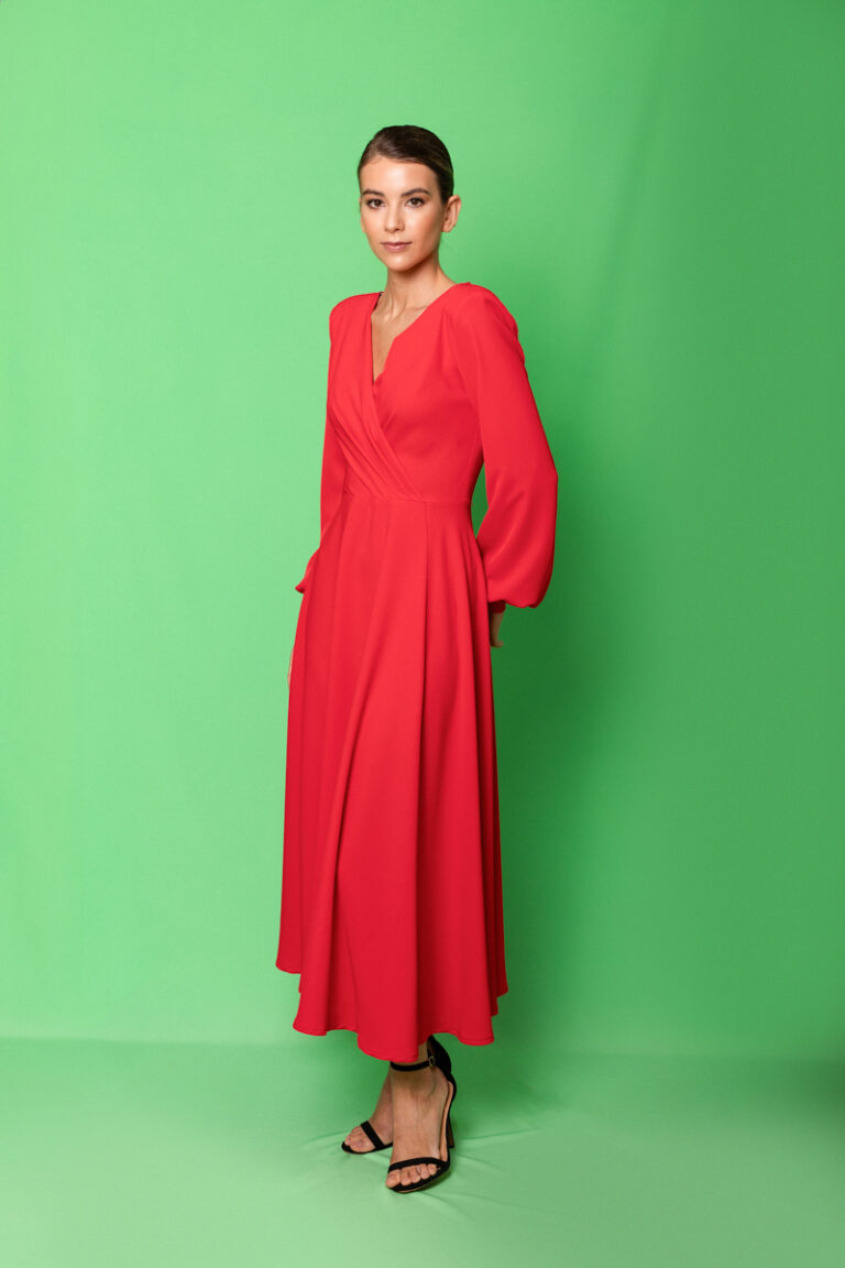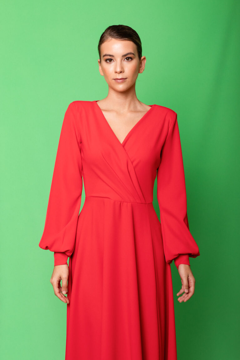 Vestido en tejido crepe con elastano con corte cruzado en pecho y falda en vuelo.