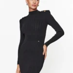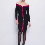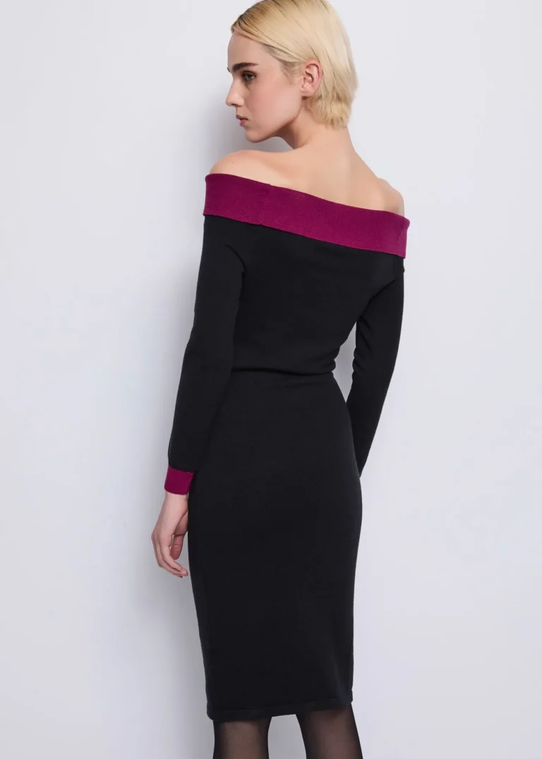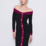 Vestido en tejido de punto, escote bardot con botones decorativos en dorado.