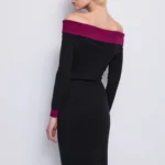 Vestido en tejido punto combinado con gasa y drapeado lateral. Escote Bardot vuelto.