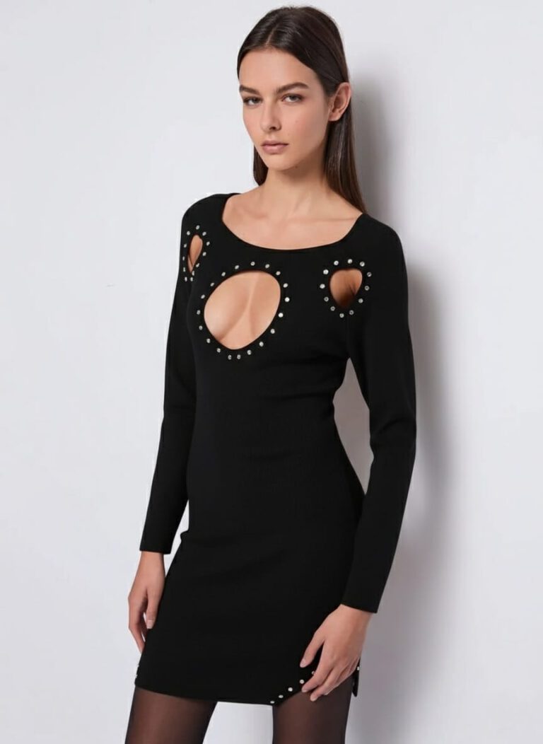 Vestido en tejido de punto con aberturas en pecho y laterales, detalles en tachas con cristal decorativos en aberturas. Bajo asimétrico con detalles en lateral.