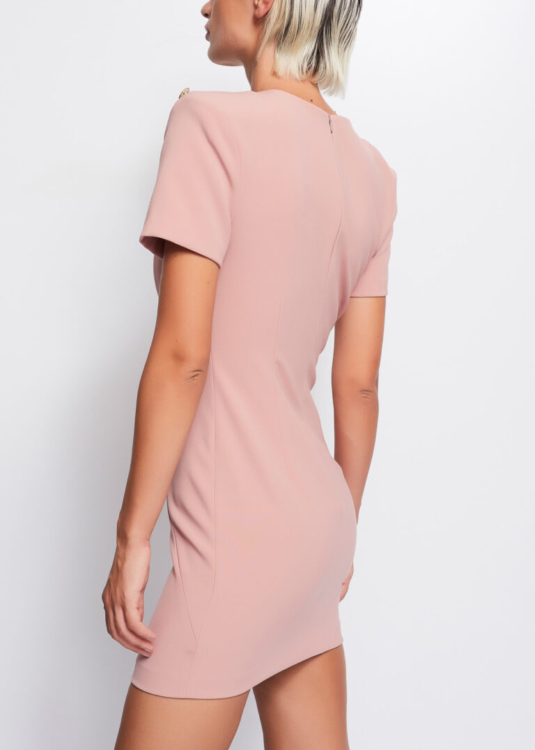 Vestido en tejido crepe con elastano con maxi hombrera y botonadura vista en hombros.